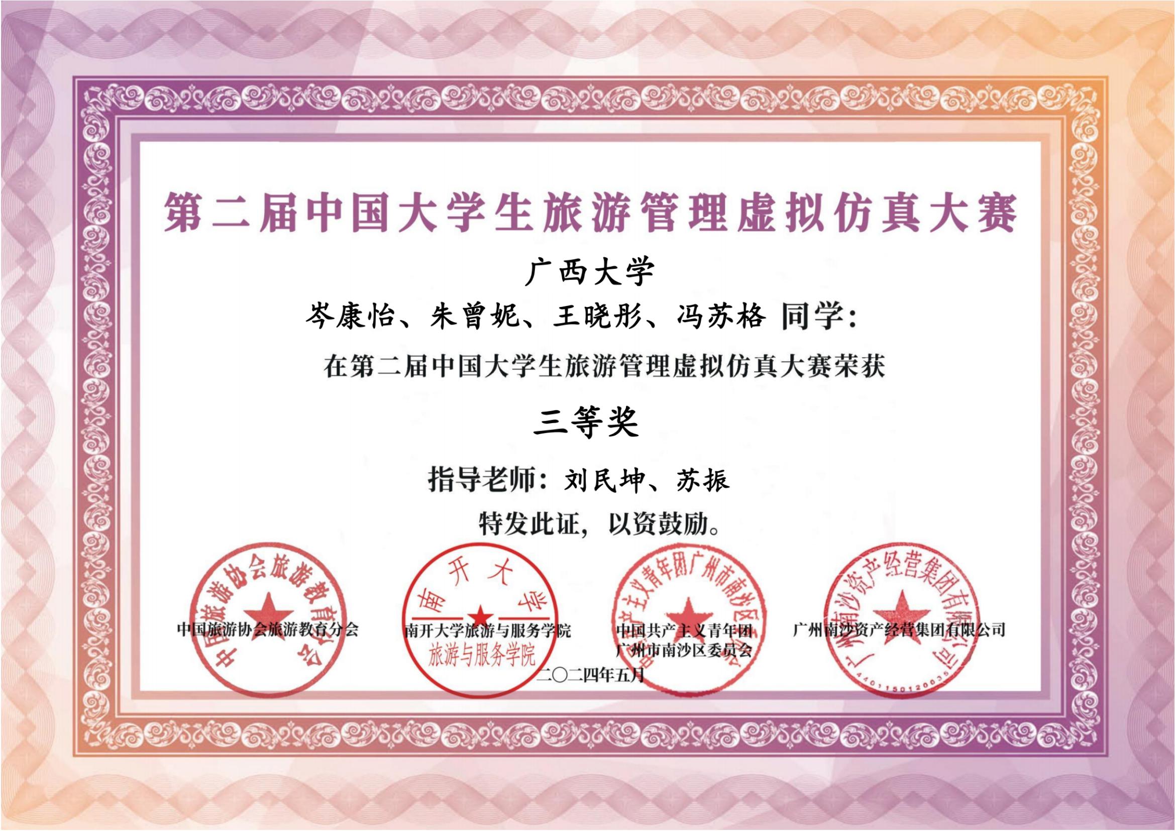等单位主办的第二届中国大学生旅游管理虚拟仿真大赛落下帷幕,蘑菇视频旅游管理专业2023级本科生(岑康怡,朱曾妮,冯苏格,王晓彤)组成的参赛队伍表现出色,荣获大赛三等奖。