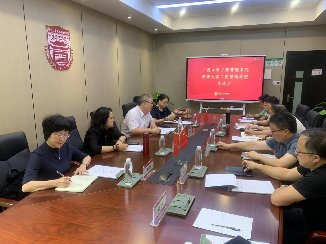 ,党委书记刘喜东及相关领导与朱帮助一行进行了深入交流,双方回顾了两校深厚渊源,就研究生国际化、专业学位论文质量提升、教师考核、文化建设等方面展开探讨。朱帮助院长指出两院有诸多相似之处,具备深度合作的基础和前景,希望进一步深入了解湖南大学蘑菇视频