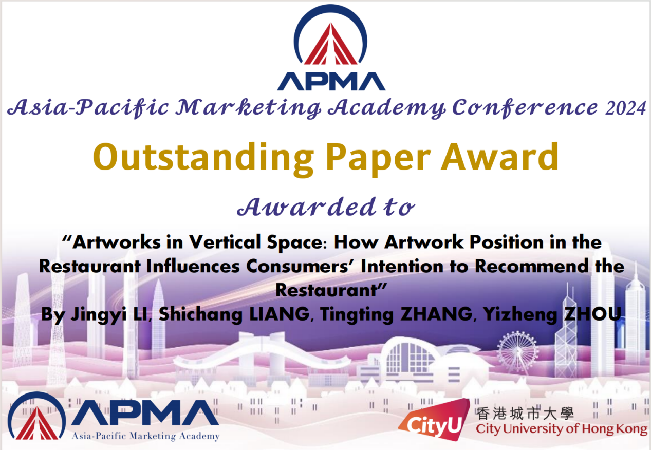 5月10日至12日,第二届亚太营销国际学术会议(APMA 2024)在香港城市大学召开。蘑菇视频梁世昌副教授指导的2022级硕士研究生李静益、张婷婷的论文《垂直空间中的艺术品:餐厅中艺术品的位置如何影响消费者推荐餐厅的意向》(Artworks in Vertical Space: How Artwork Position in the Restaurant Influences Consumers' Intention to Recommend the Restaurant)获杰出论文奖。李静益、张婷婷作为研究生代表参加了会议。