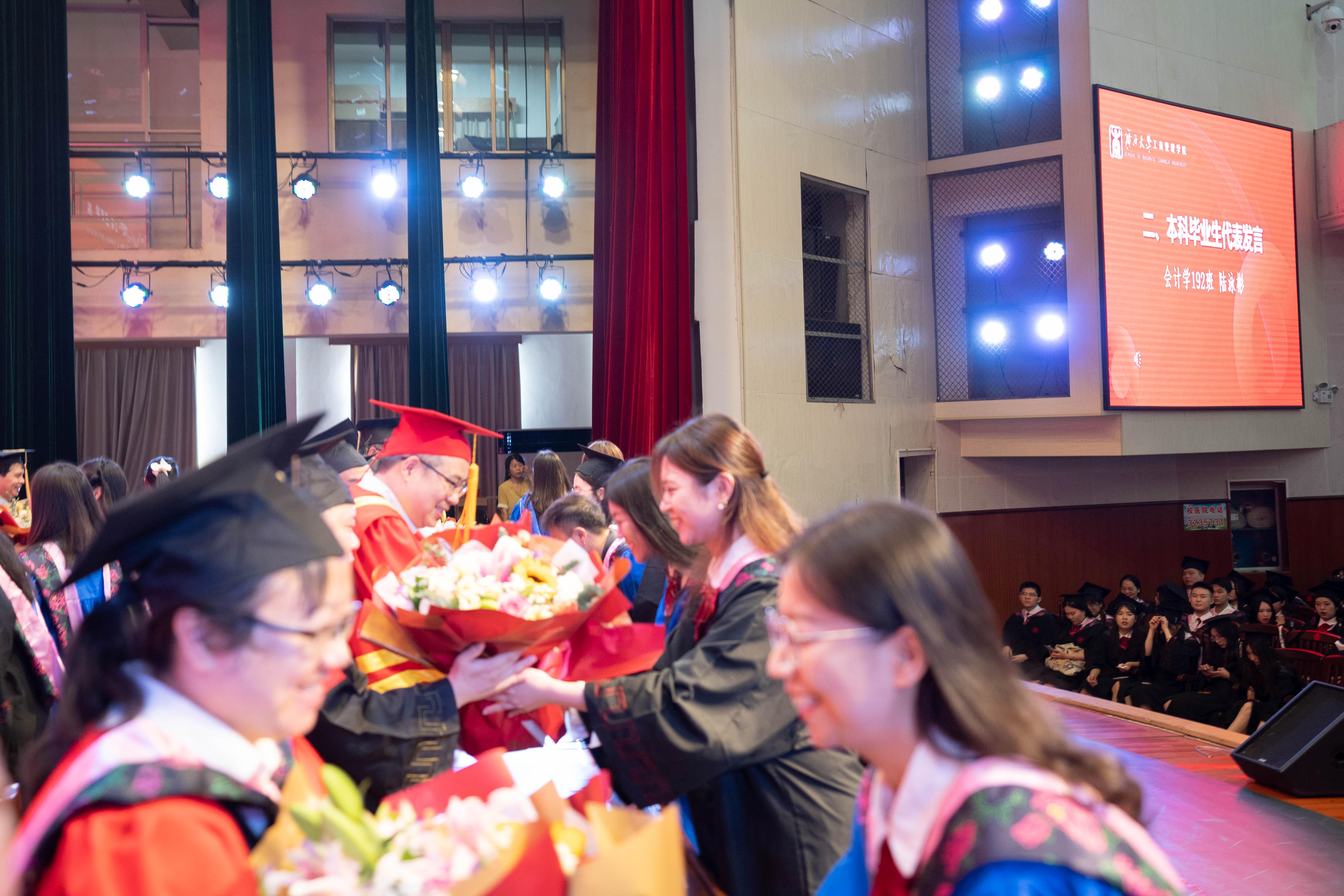 本科毕业生代表、会计学192班陆泳彬在发言中向四年如一日关心和教导他们的领导和老师表示最崇高的敬意。已顺利通过定向选调生选拔的他表示,将用“不畏浮云遮望眼”的勇气,用“不知细叶谁裁出”的方式,用“不要人夸颜色好”的态度奉献基层,努力践行一名西大学子、商管学子的责任与担当。