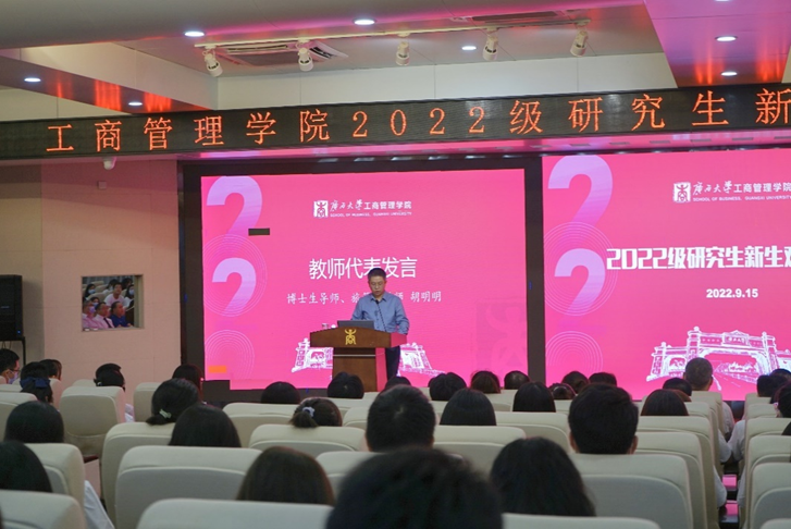 工管222班班主任、财管系教师潘柳芸,博士生导师、旅管系教师胡明明作为教师代表发言。潘老师向各位新同学表示热烈的欢迎与祝贺,希望同学们心如花木,向阳而生,满腹家国情怀,祝愿大家在大学四年中学有所思、学有所悟、学有所成。胡老师从自身科研经历出发,分享三点经验:第一,做学术先做人,要增强社会责任感;第二,要培养科学的研究精神,深入管理实践,敢于创新和进步;第三,要修身立德,坚守学术道德的底线。