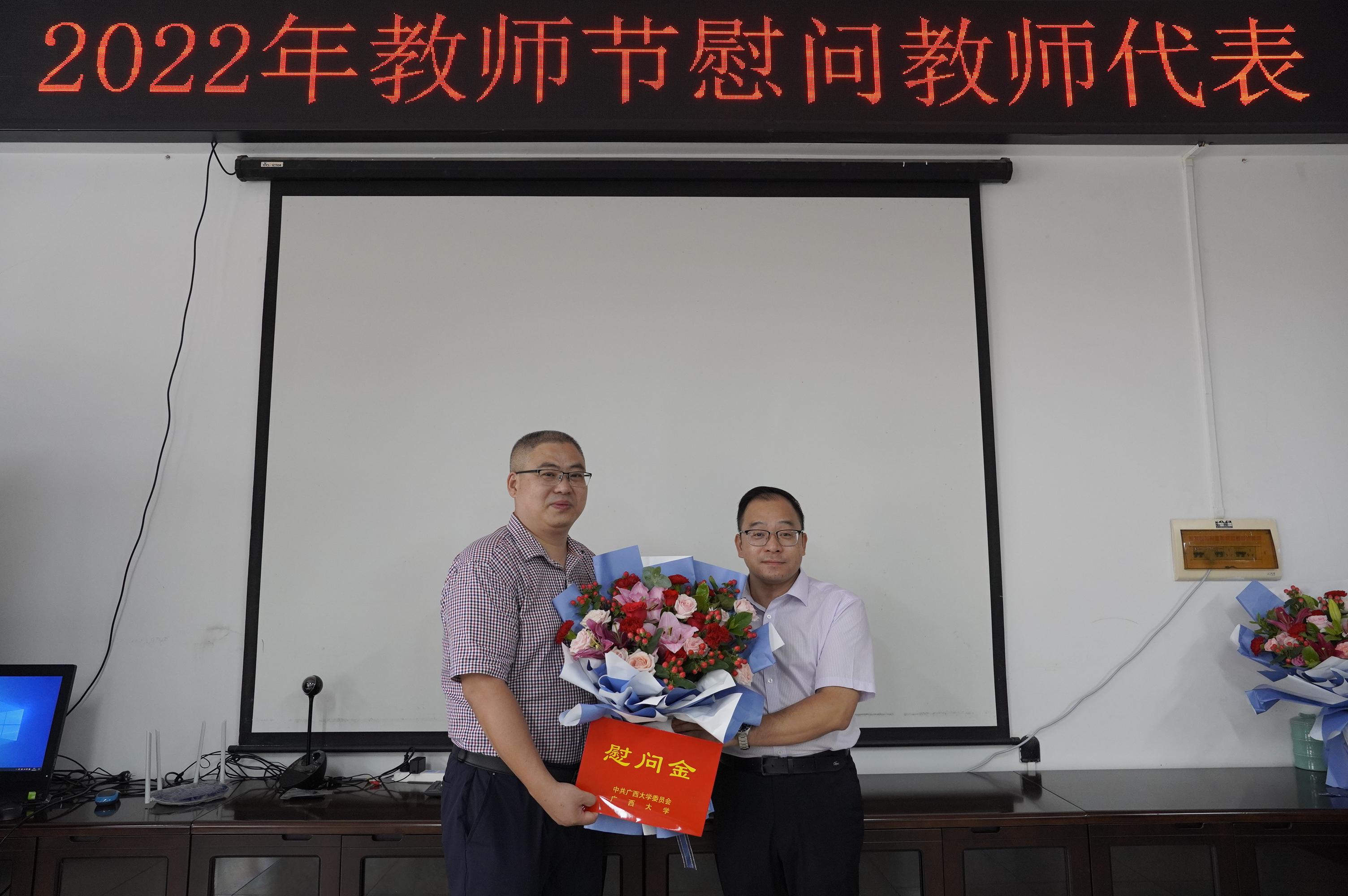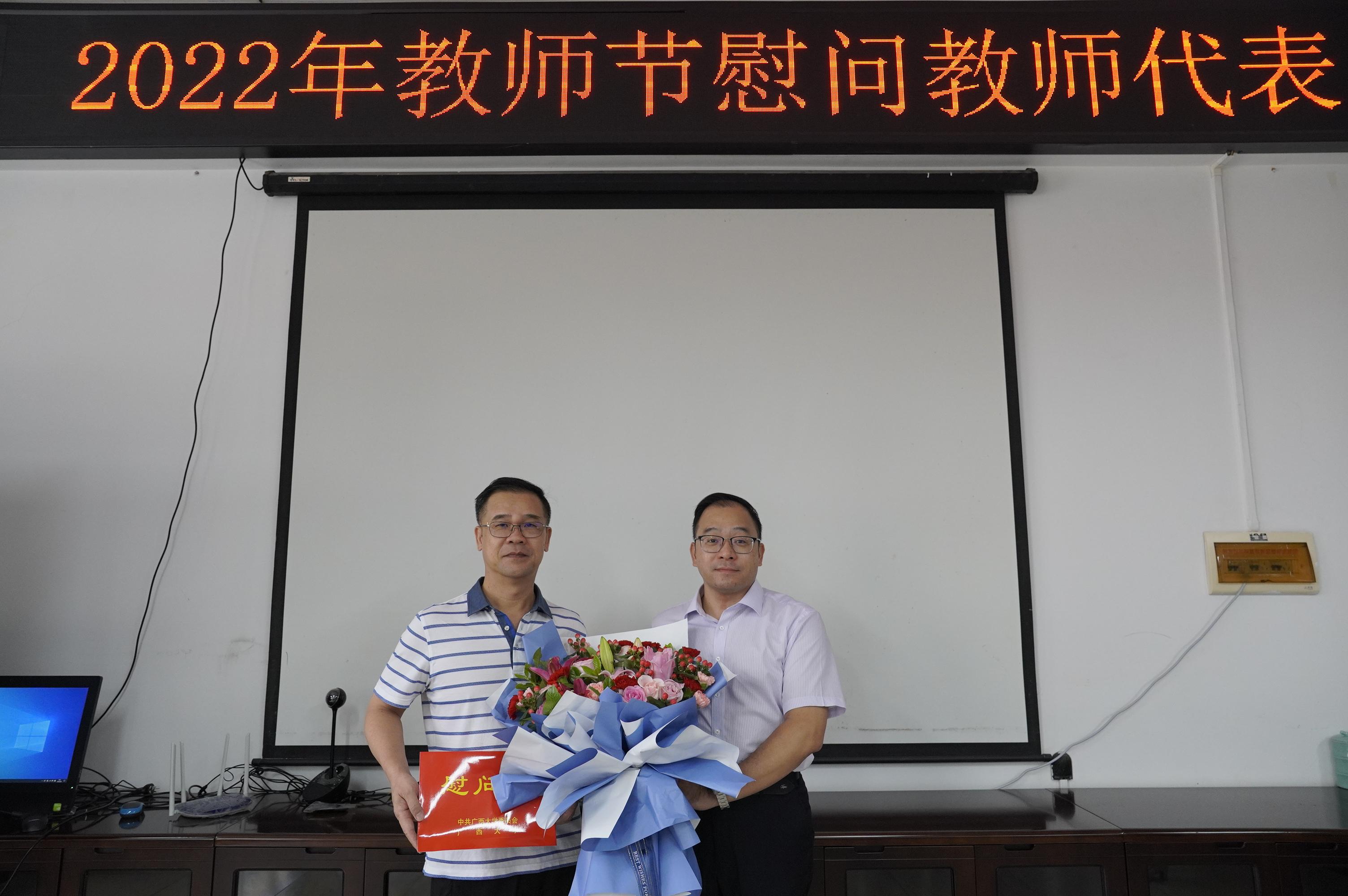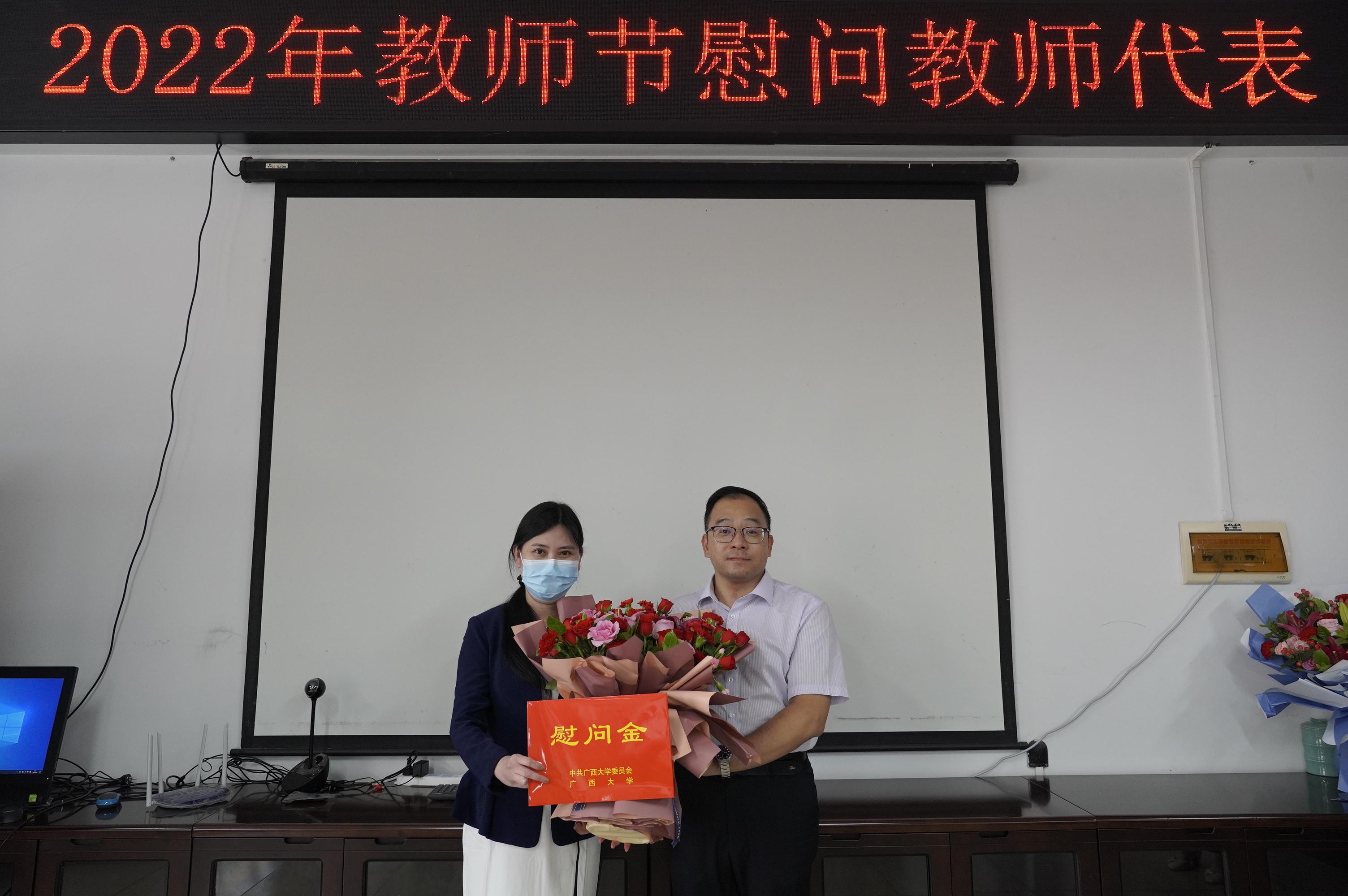 在第38个教师节和中秋佳节到来之际,9月9日上午,在学校的统一安排下,蘑菇视频党委书记罗诚受学校委托慰问朱帮助、黎鹏、韦荷琳三位老师,为他们送上了鲜花、节日祝福和慰问金,传达学校对广大教职员工的关心厚爱。接受慰问的三位教师代表对学校的关心表示衷心感谢,表示会潜心教育,积极科研,奋勇争先做好本职工作,为蘑菇视频