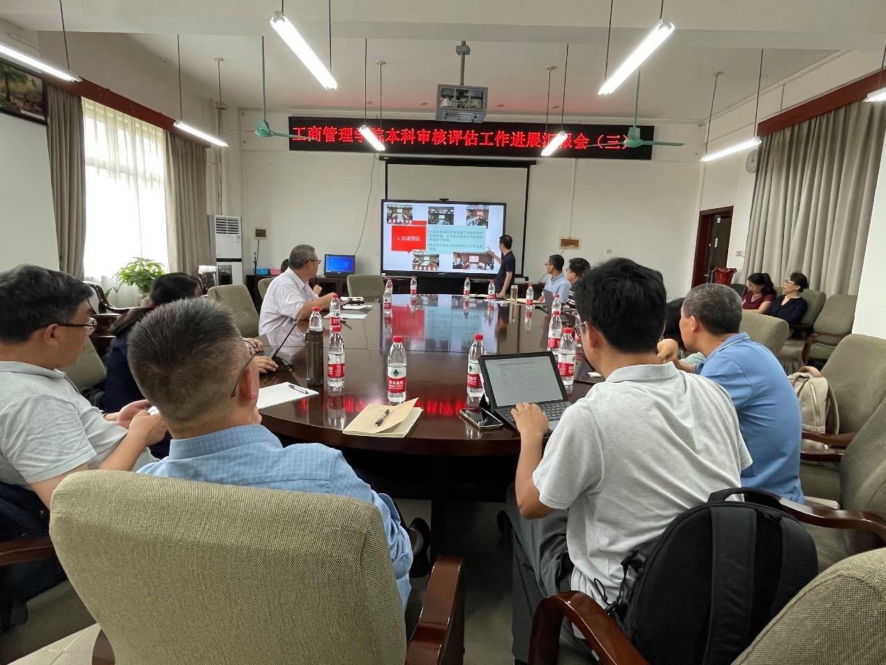 420会议室召开本科教育教学审核评估工作汇报会第三次会议。会议由院长朱帮助主持,院党委副书记黄晋、副院长申韬,以及各系、各部门负责人参会。