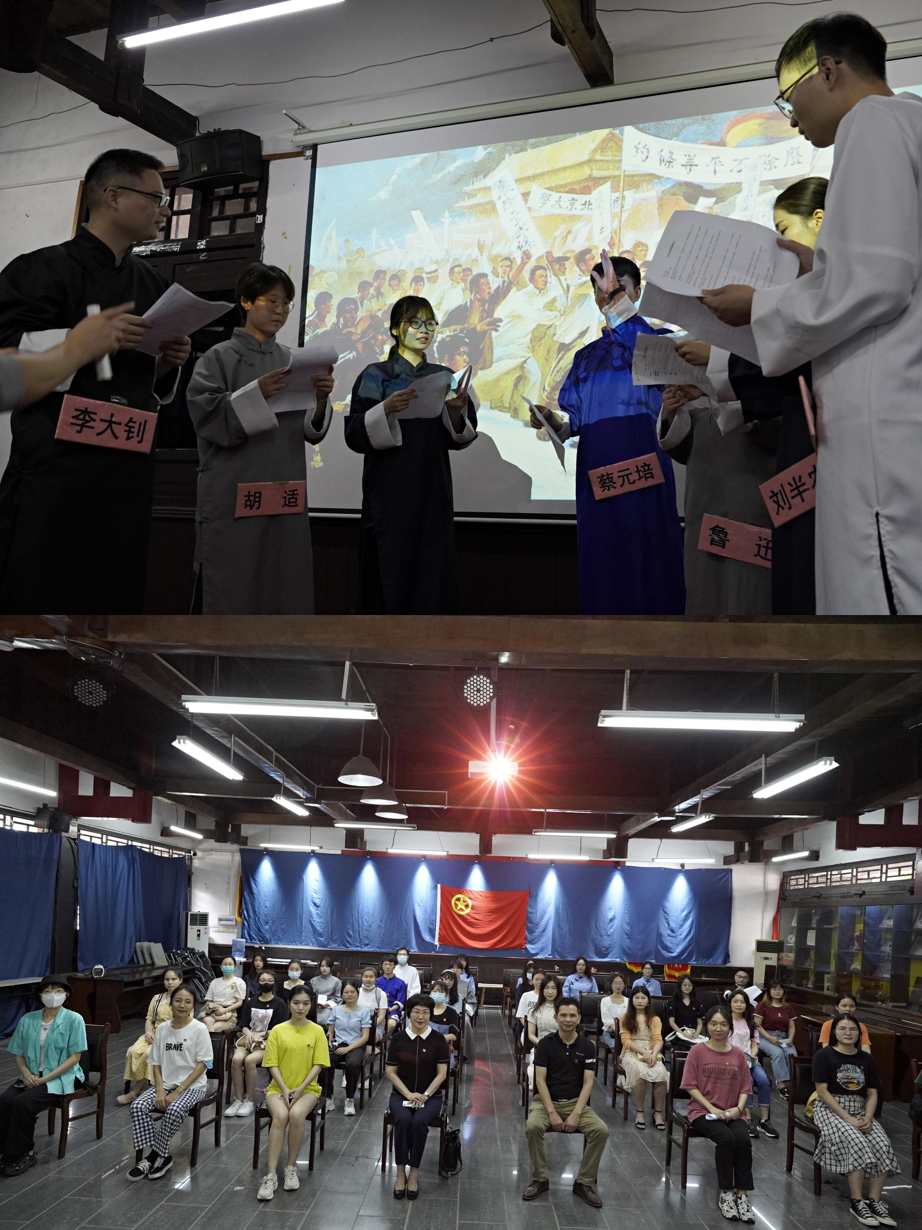 党委委员、副院长廖东红同志的带领下,研究生第一党支部、第二党支部的党员到南宁市共青团纪念馆开展“青春心向党,建功新时代”主题党日活动。同学们参观了共青团纪念馆“战斗的青春”、“建设的青春”、“改革的青春”、“青春的记忆”四个主题展区,并通过扮演胡适、鲁迅、李大钊等11位五四运动时期的爱国青年和知识分子开展情景教学,再现了一群胸怀理想与伟大抱负的青年同志为了国家大义,积极传播新思想与新文化的积极昂扬的精神风貌。