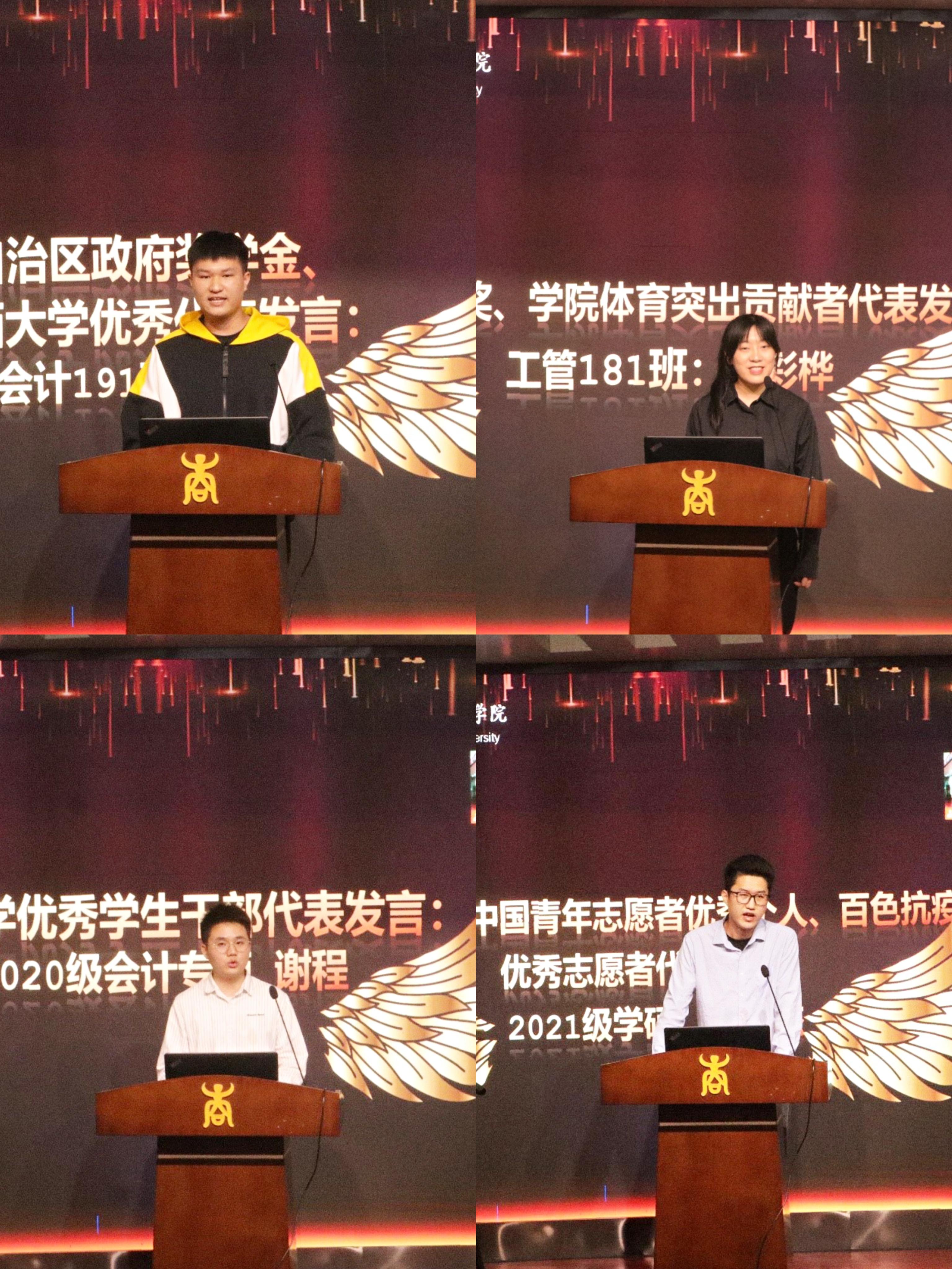 优秀学生干部代表谢程,第十三届中国青年志愿者优秀个人、百色抗疫优秀志愿者代表陈允杰等四位同学分别上台发表获奖感言。他们对蘑菇视频