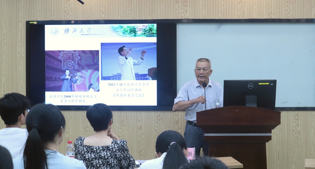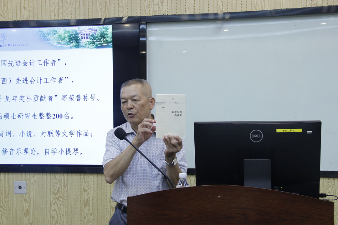 辛勤耕耘的辉煌历程。他的分享不仅让在座的同学们仿佛穿越时空,亲身感受那段艰苦奋斗却充满光辉的岁月,更展现了韦教授对党的忠诚和对教育事业的热爱。韦教授的人生之路并非坦途,他的成功背后是无数次的努力与坚持。他用自己的亲身经历告诉大家,对学习的渴望和对卓越的追求是支撑他不断前行的重要动力。在讲述过程中,韦教授还特别强调了青年时期树立人生目标的重要性,并分享了诗歌及文学对他个人成长和树立人生目标的深远影响。