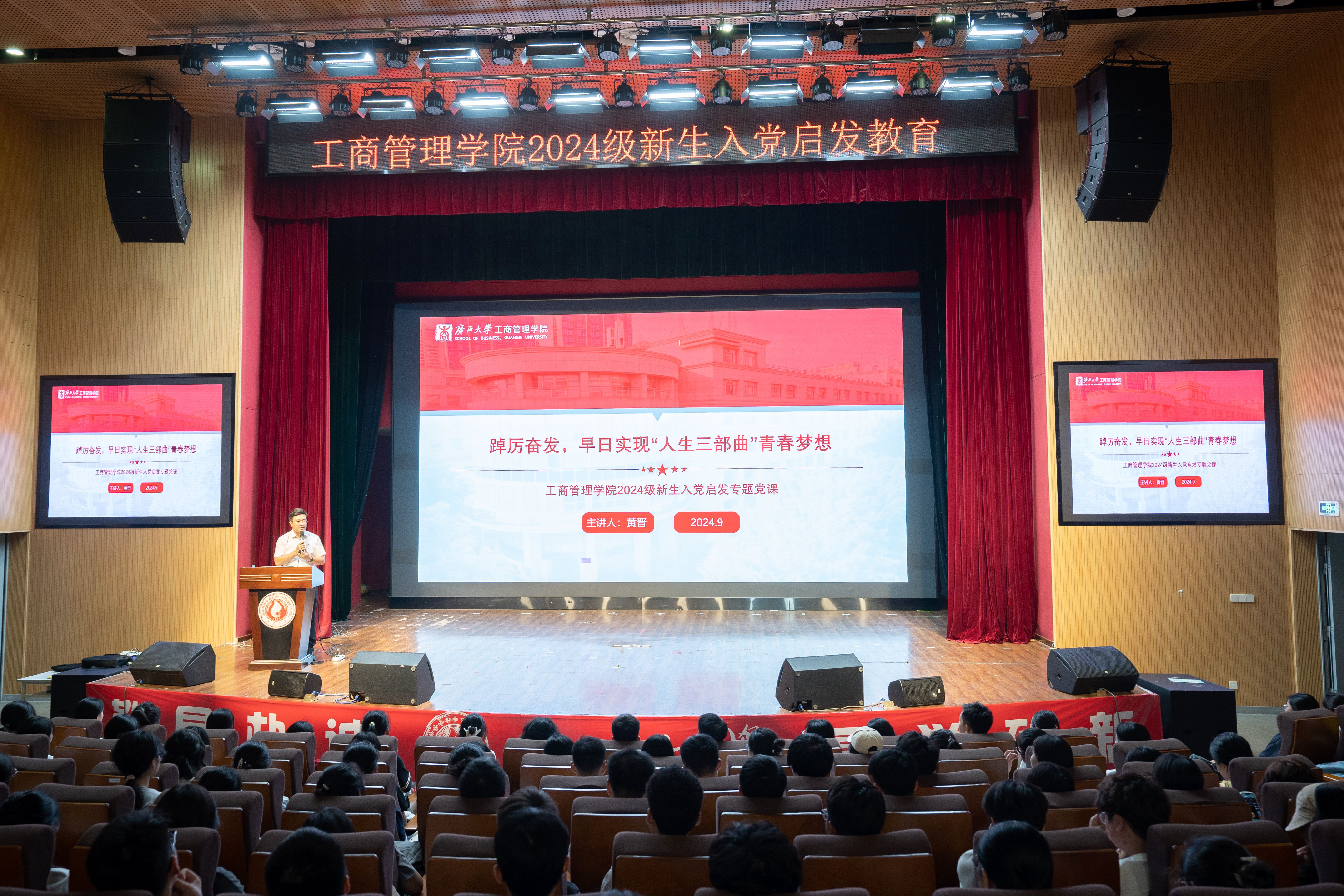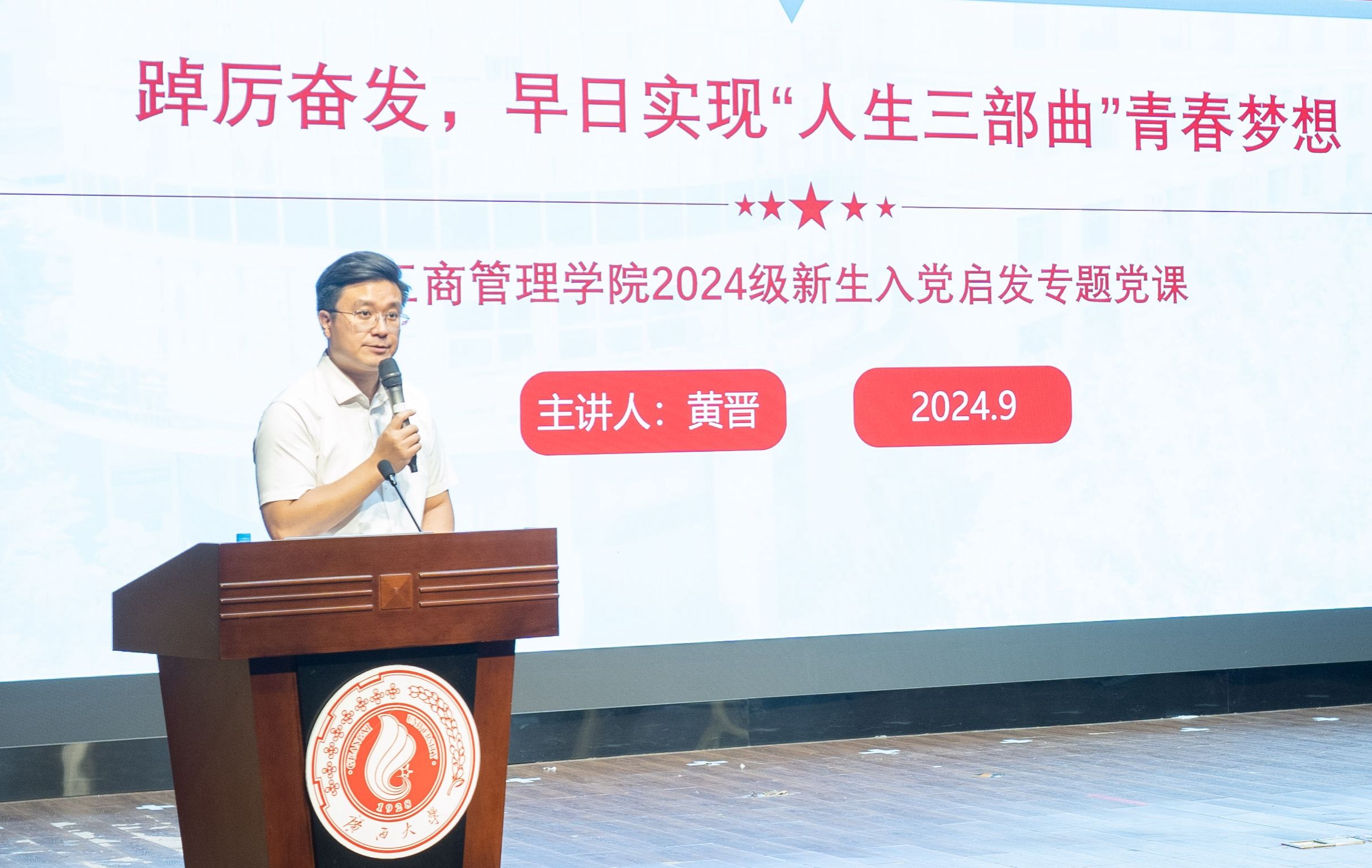 党委书记黄晋主讲,院党委副书记肖克宁、组织员黄照温、学工组辅导员郁文丹、管雅娣与全体新生一同参与学习。