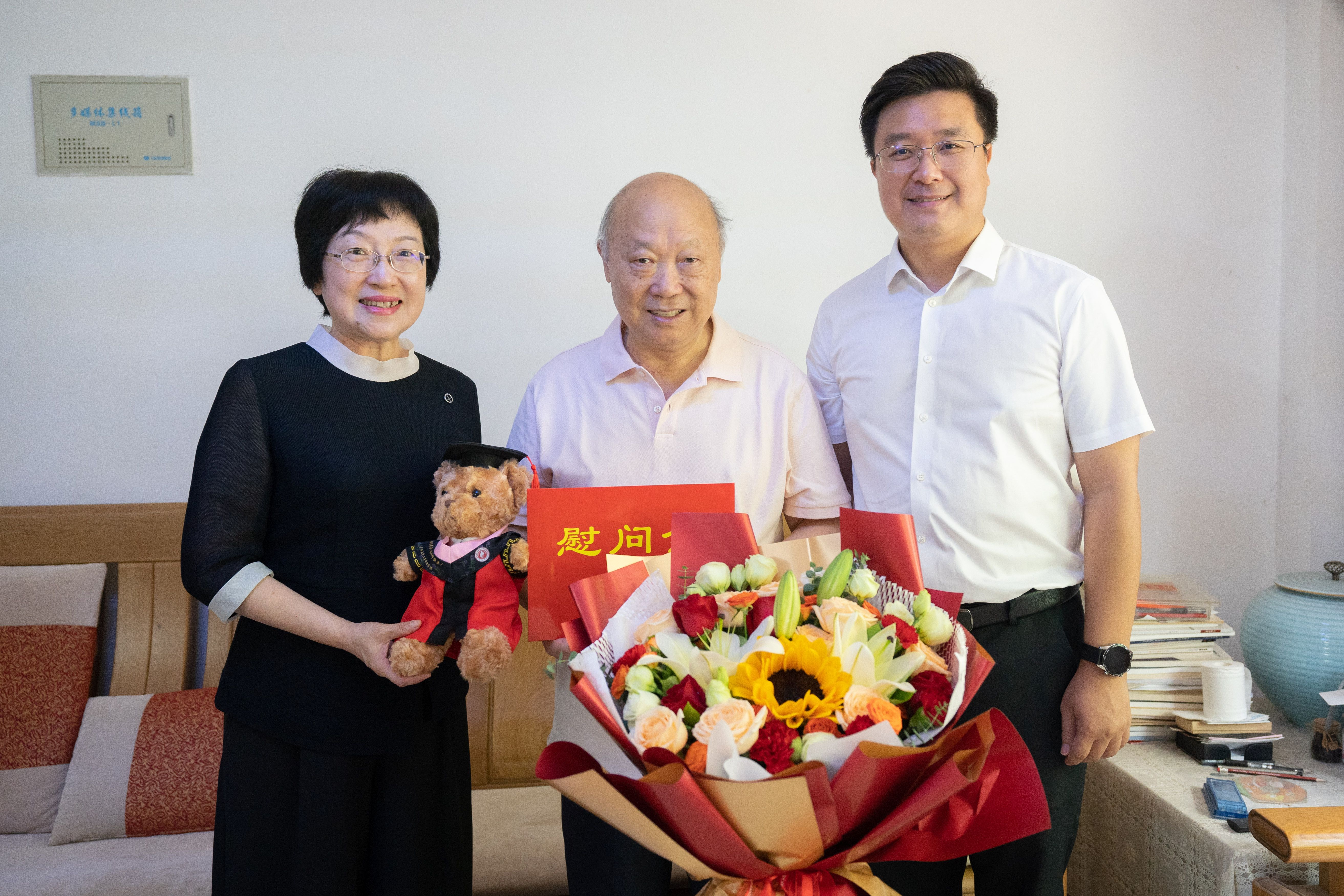 领导向阳国亮老师(中)送上鲜花和慰问金