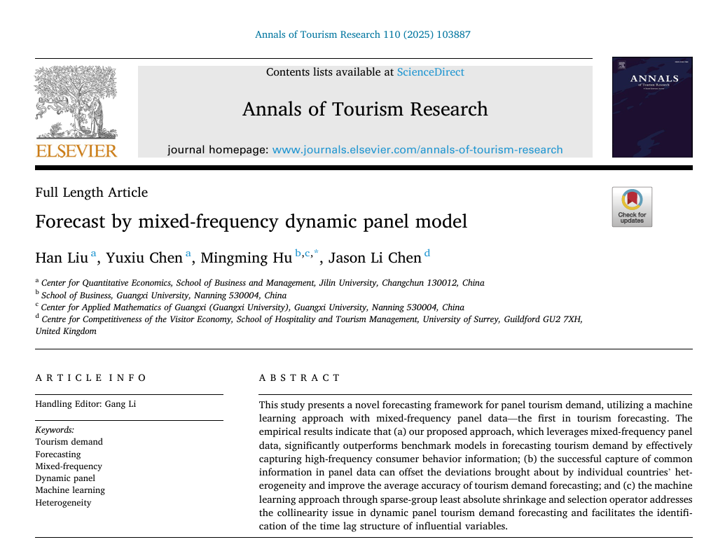 近日,蘑菇视频胡明明团队在旅游需求大数据混频预测领域取得新进展,构建了一个基于混合频率动态面板模型的旅游需求预测框架。相关成果以”Forecast by mixed-frequency dynamic panel model”为题,在旅游管理国际三大顶刊之一的《Annals of Tourism Research》上发表。