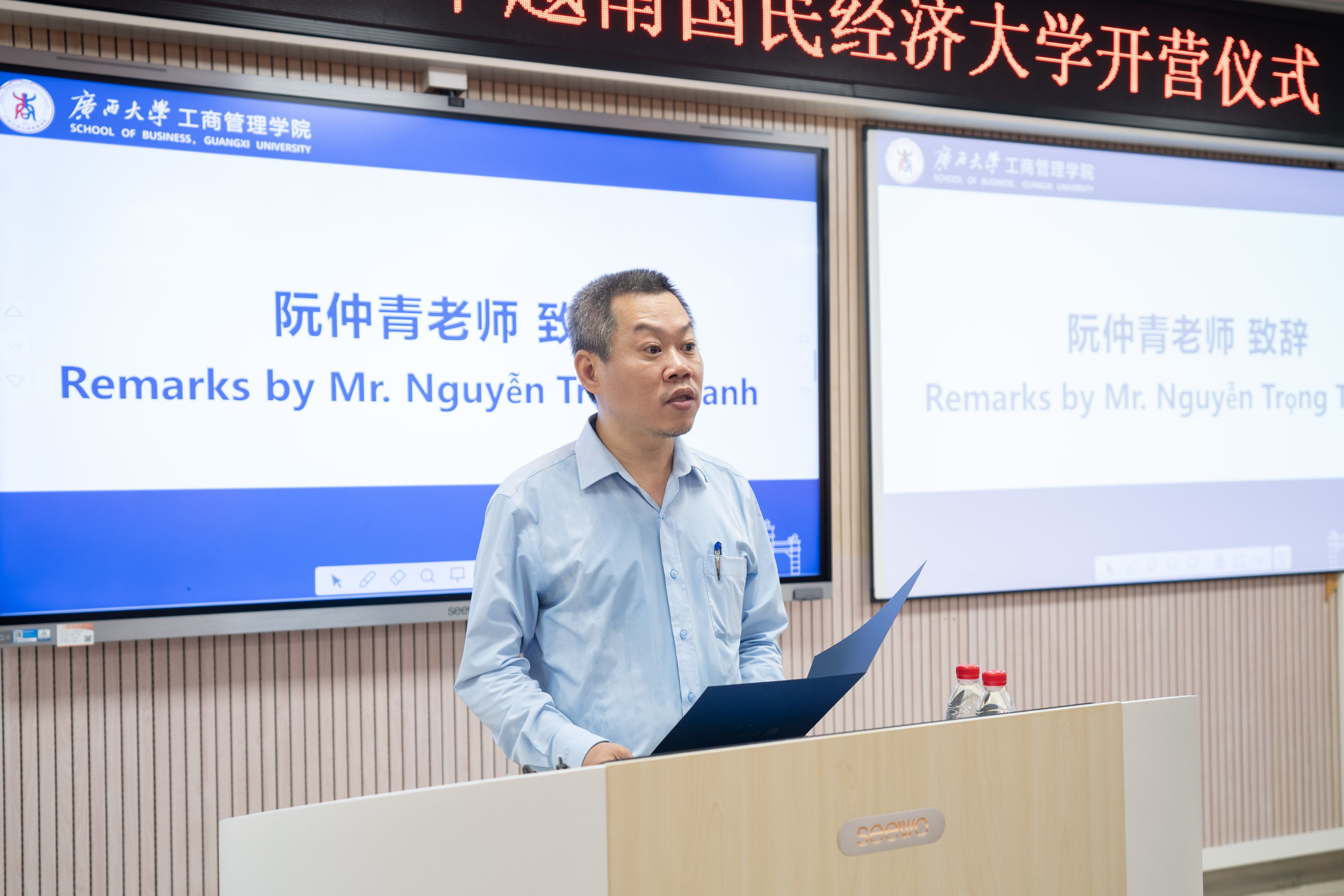 党委书记黄晋,越南国民经济大学教师代表阮仲青(Nguyễn Trọng Thanh)出席仪式。院长助理韦铁主持仪式,越南国民经济大学19名师生参加仪式。