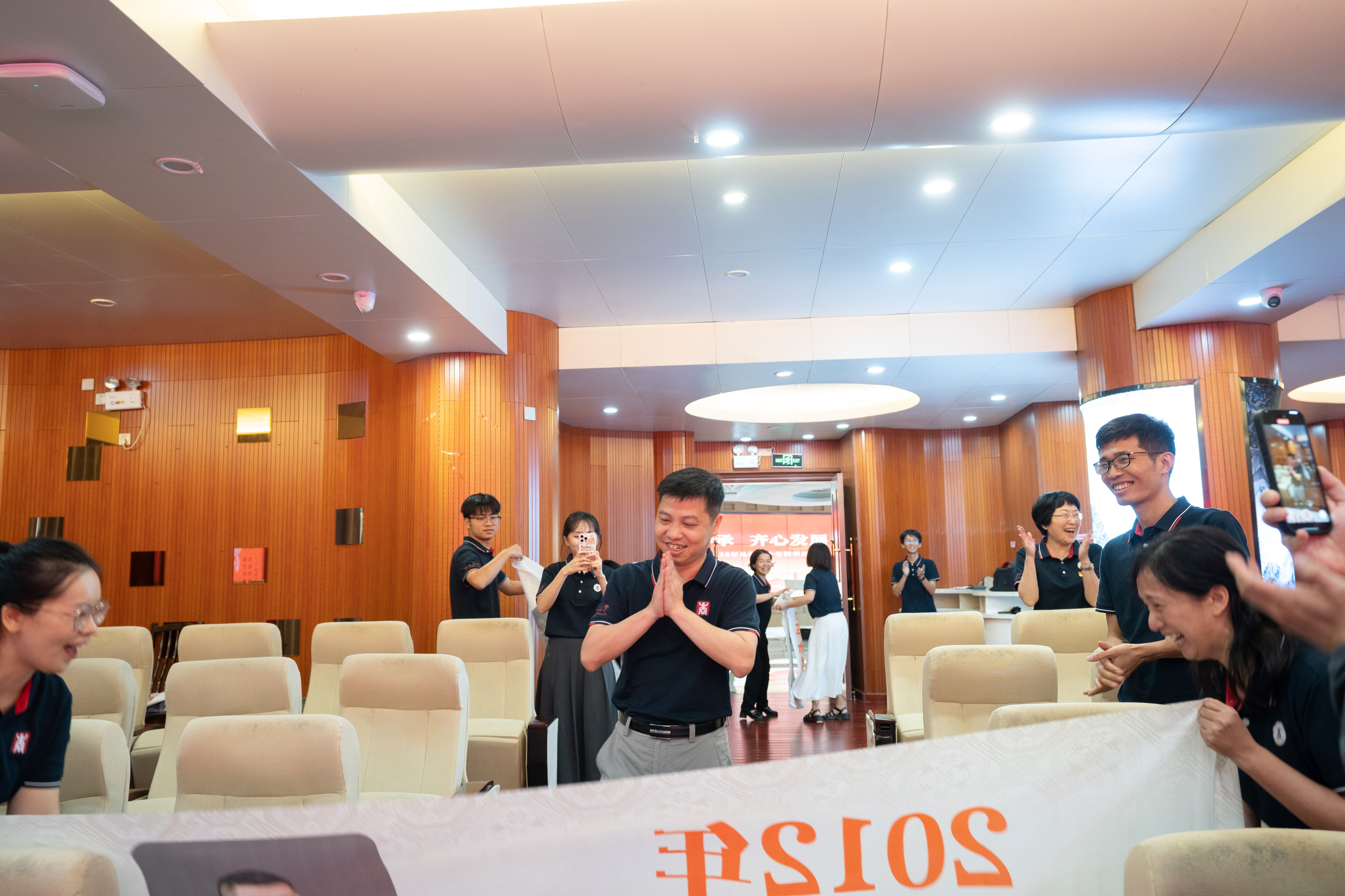 精心设计的五组纪念横幅沿通道徐徐展开,每幅横幅以时间轴形式呈现他们职业生涯的关键节点:从初登讲台的青涩岁月,到获评职称的重要时刻;从一名普通教师的平凡瞬间,到独当一面的专业负责人……这些珍贵的画面在横幅上一一展现,勾勒出最动人的“奉献长卷”,让在场的每一个人都能深刻感受到他们从教多年的坚守与付出。五位老师看着横幅上的自己,眼中闪烁着泪光,那是回忆的光芒,也是对教育事业深厚情感的流露。