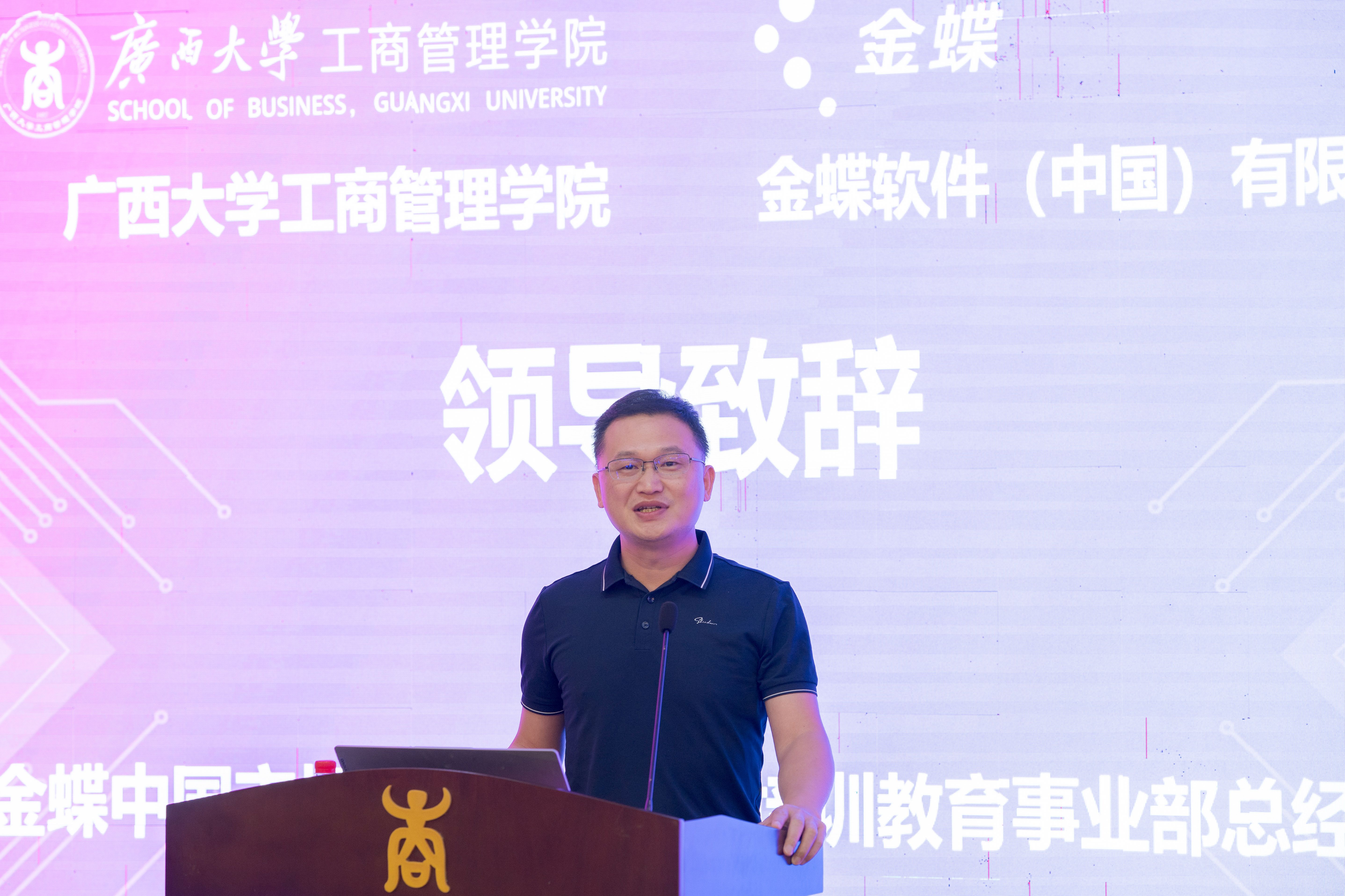 金蝶广西分公司市场部总监游阳、解决方案部高级顾问邓旭、院校业务经理韦晓春,蘑菇视频