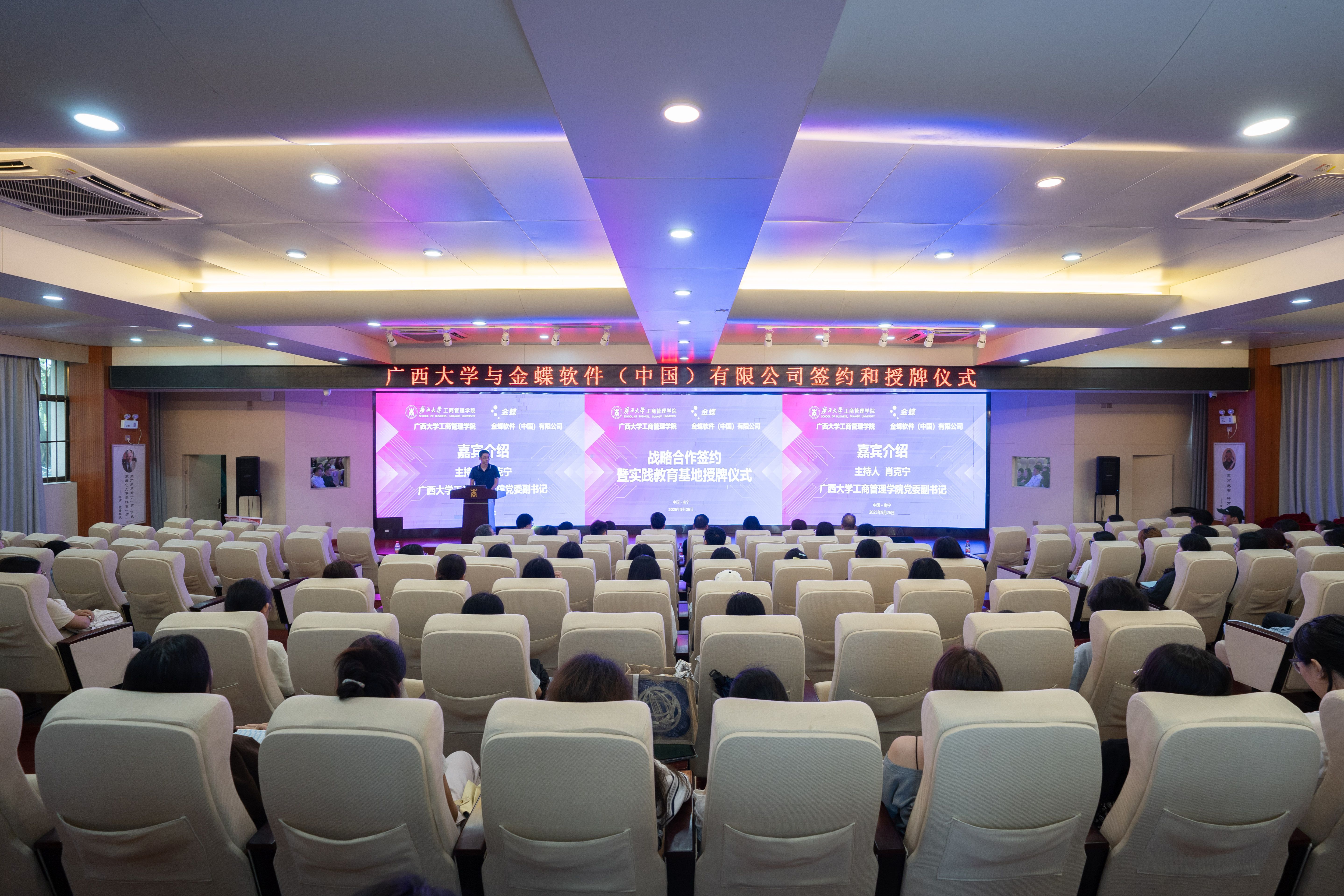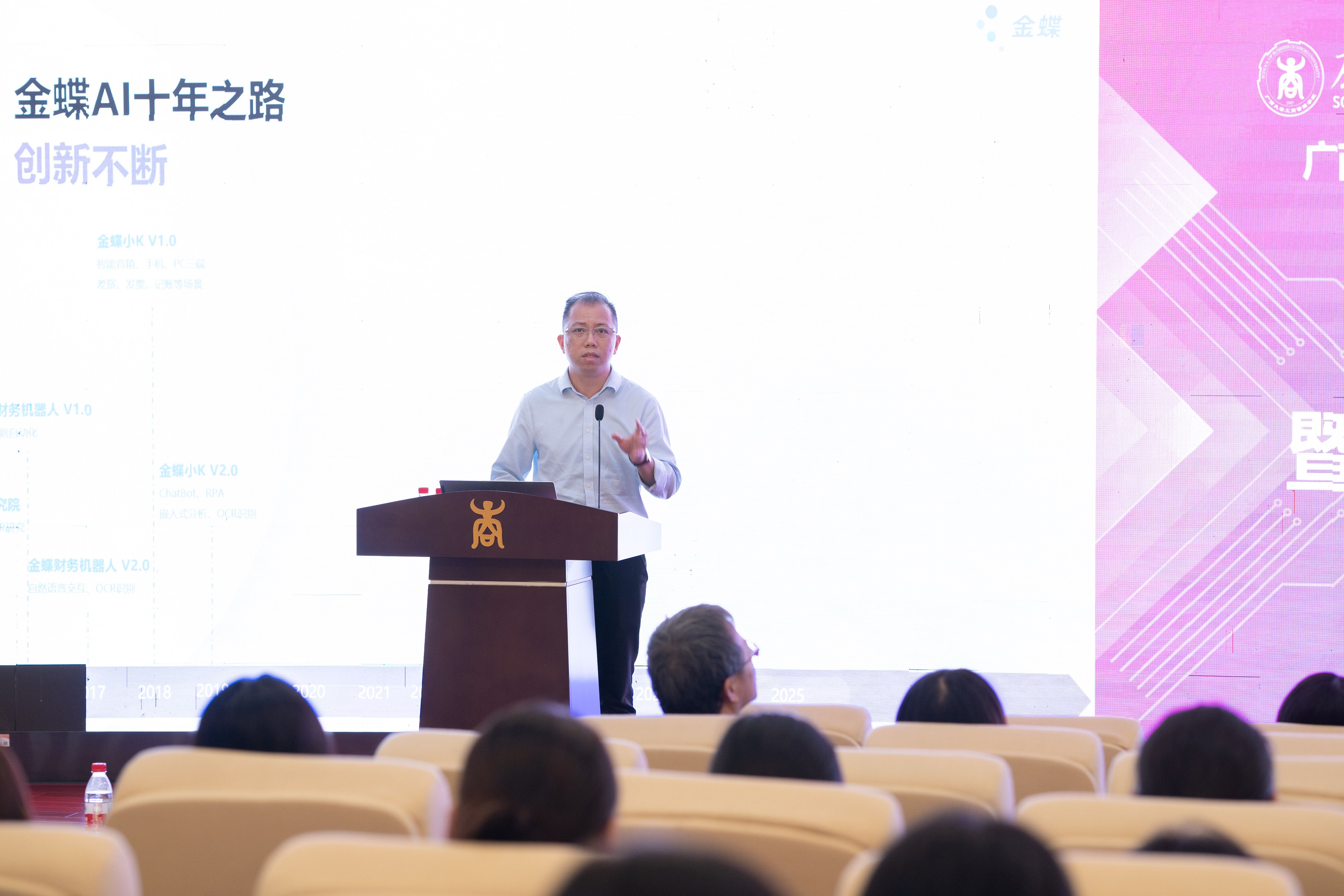 仪式上,赵亚妮以《AI+管理 成就不凡——校企携手赋能数智化人才培养》为题,结合真实案例与数据,系统阐述“AI+管理”如何重塑企业运营与高等教育模式,为现场师生勾勒出校企协同育人的清晰路径。金蝶技术团队负责人邓旭现场演示金蝶云·苍穹平台的AI应用能力,包括财务大模型、金玥财报、智能报销、数字招聘等核心功能,生动呈现AI在企业管理中的前沿应用,让在场师生直观感受到了人工智能的独特魅力与广阔前景。