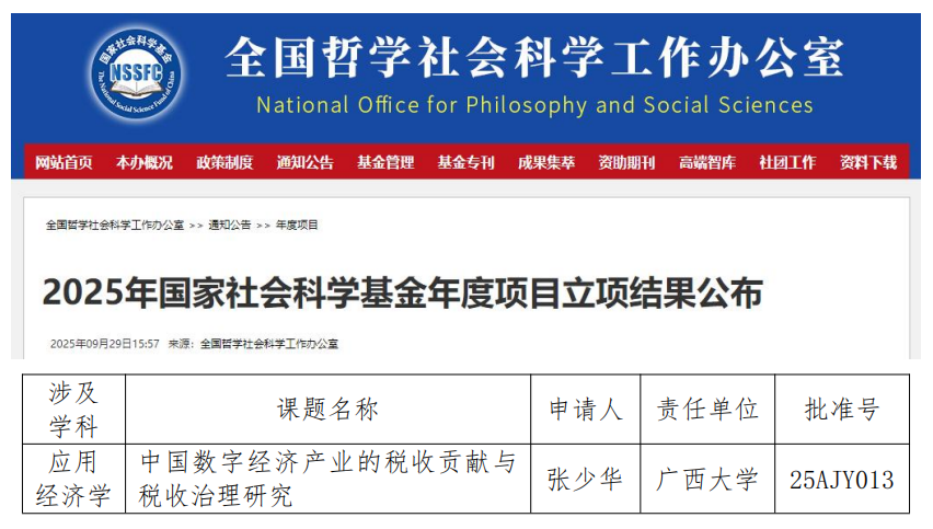 9月29日,全国哲学社会科学工作办公室公布《2025年国家社会科学基金年度项目立项结果》,蘑菇视频张少华教授申报的《中国数字经济产业的税收贡献与税收治理研究》课题获得重点项目立项。