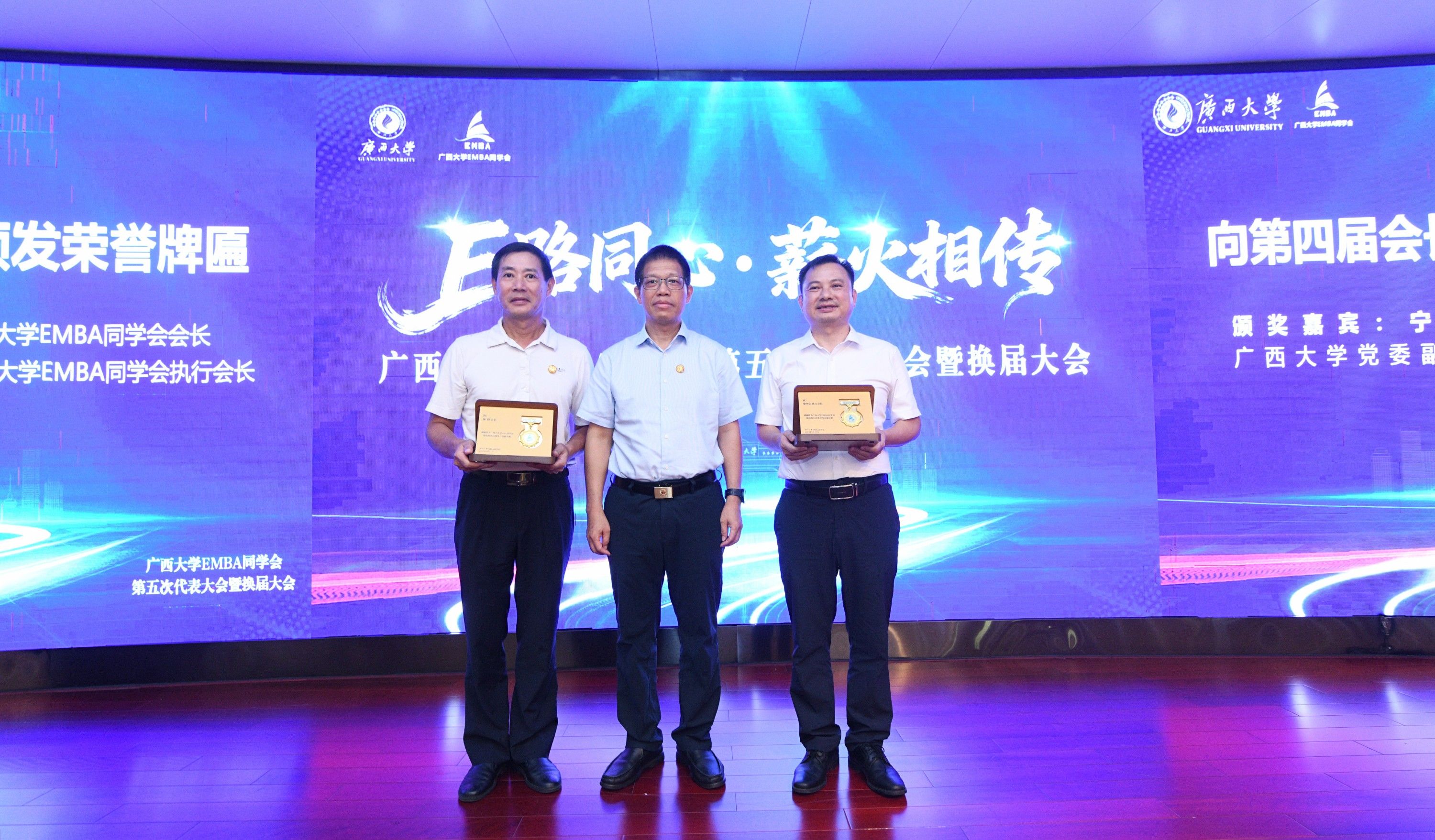 EMBA同学会第五届组织机构成员建议名单》。校友苏尔田当选为新一届会长,庞勤、陈轲当选为新一届执行会长和秘书长。出席大会代表、嘉宾共同见证了会旗交接仪式。宁旭初等为第四第五届组织机构成员分别颁发荣誉牌匾和聘书。