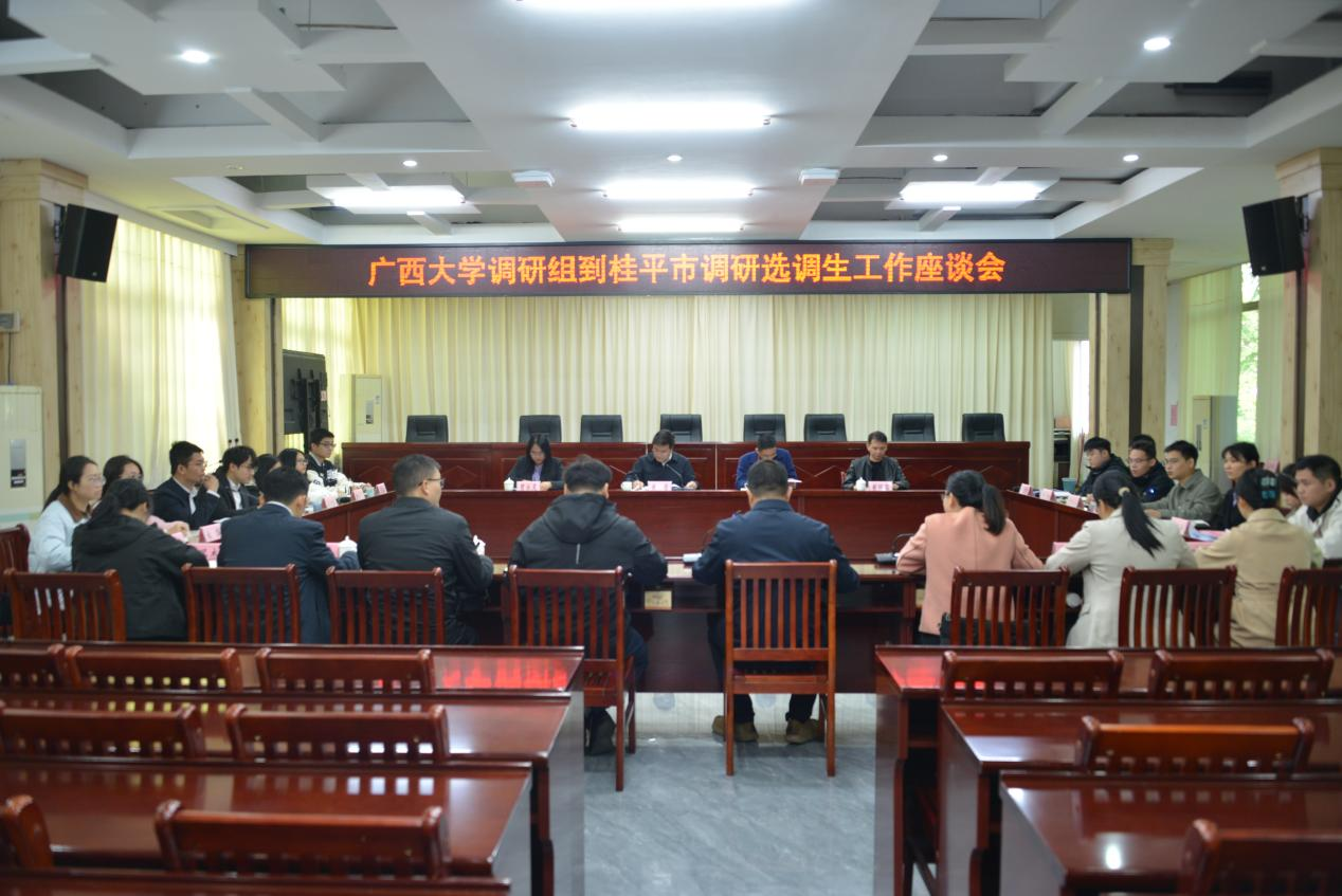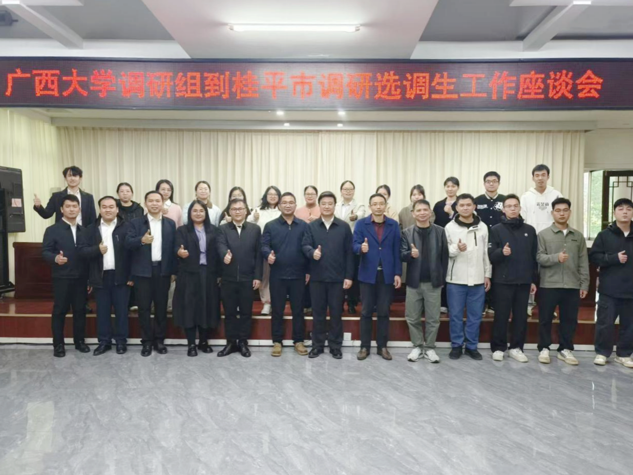 党委书记黄晋带队赴桂平市开展走访调研选调生工作,院党委副书记肖克宁、校学工部(处)贾永灵、院党委组织员黄照温参加调研。桂平市政协副主席何雁会见了调研团,桂平市委组织部副部长李雄鹏出席并主持座谈会,在桂平市工作的21名选调生校友参会交流。