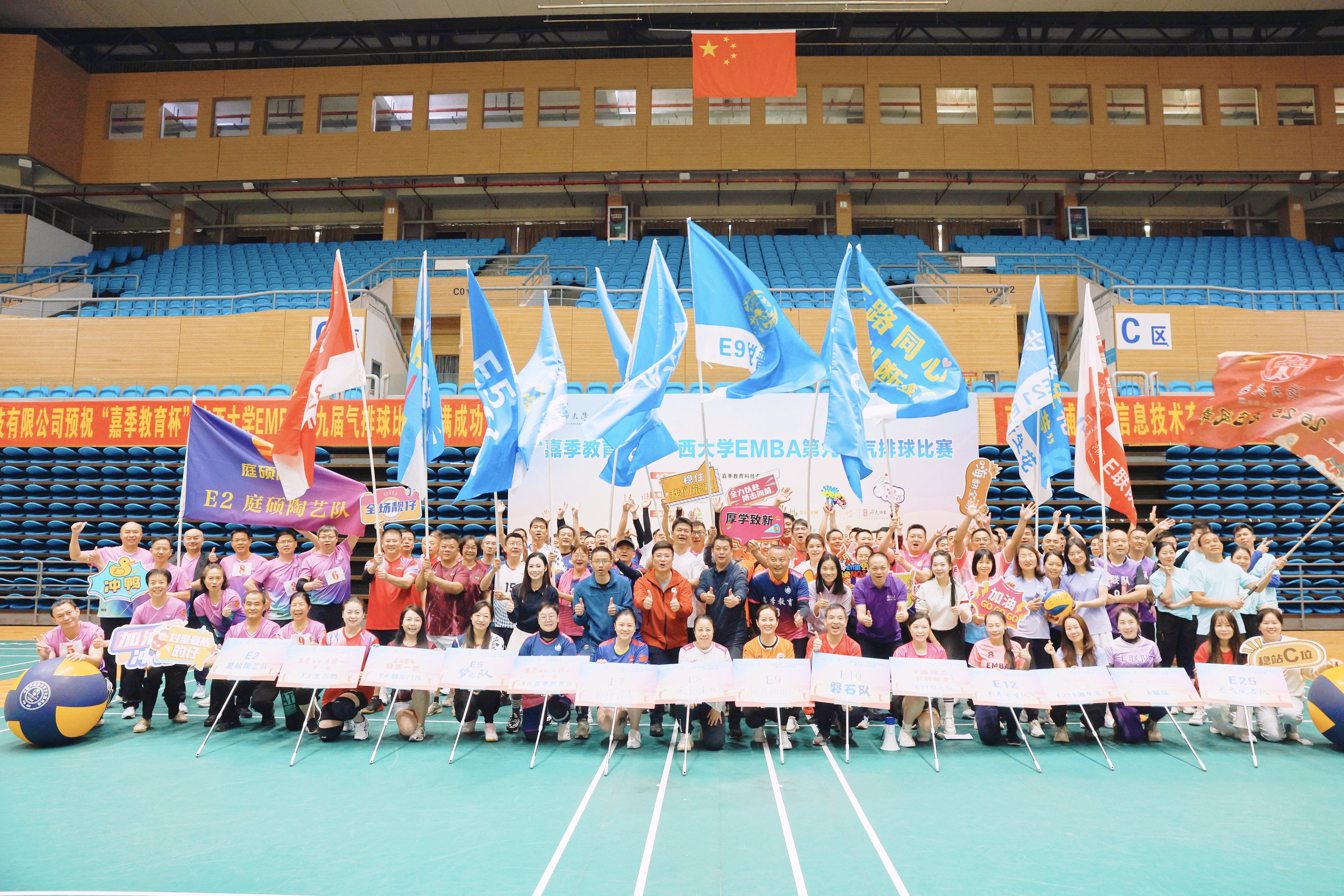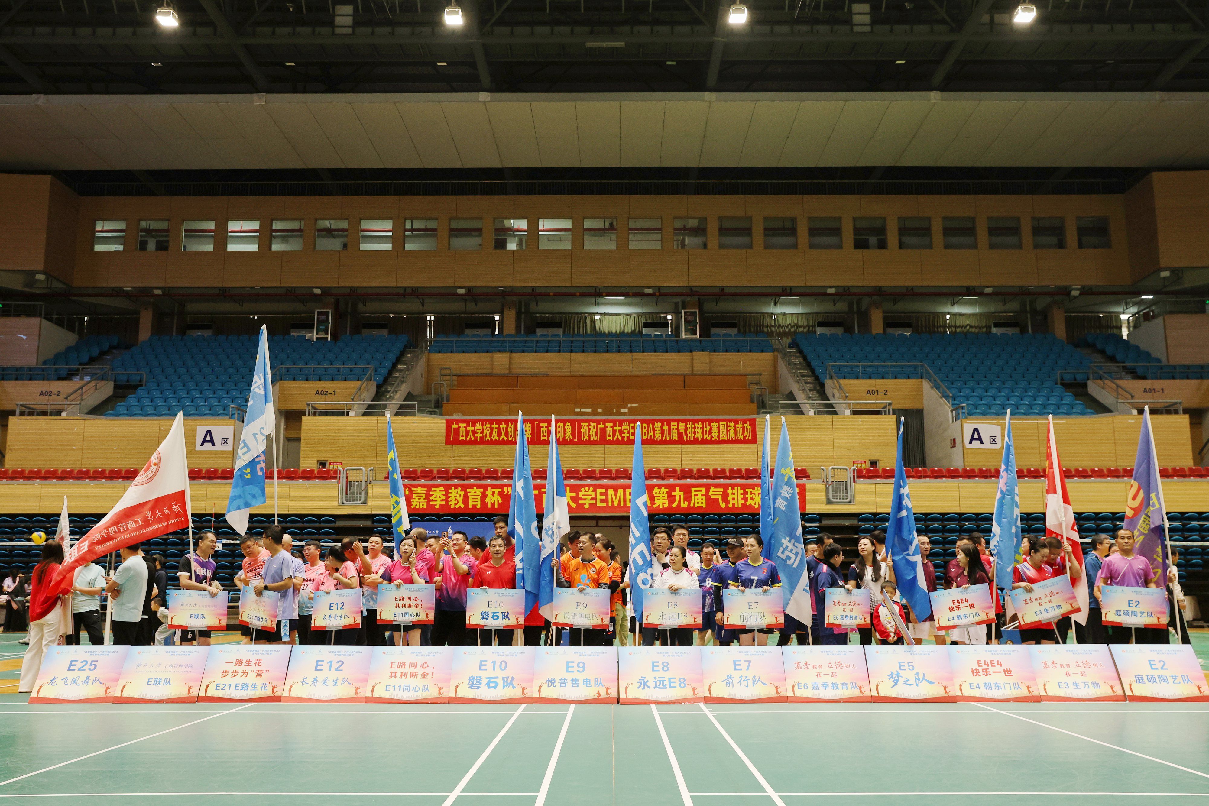 党委书记黄晋、党委副书记肖克宁、EMBA教育中心主任宁雪莲,广西嘉季教育科技有限公司董事长、EMBA第五届同学会执行会长庞勤,秘书长陈轲等出席开幕式。14支班级代表队、150余位校友齐聚赛场,以球会友、共展风采。