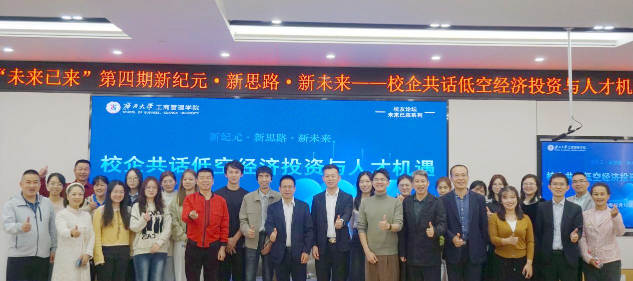 12月19日下午,学院122教室内暖意融融、智慧涌动,“未来已来”系列校友论坛第四期在此举行。本次论坛以“新纪元·新思路·新未来——校企共话低空经济投资与人才机遇”为主题,围绕低空经济在广西的发展路径规划、投资机遇挖掘与人才培育创新模式展开深度交流。论坛由学院校友工作与政企服务办公室主任覃朝勇主持。