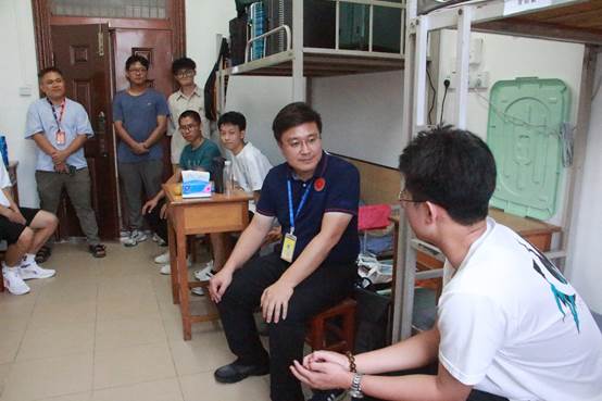 党委副书记黄晋和团委副书记岑汉成,走进本科生男生新生宿舍,关怀与问候每一位23级新生。他们认真询问新生来校路途情况,了解新生在学习、生活方面的需求,关心各地同学对广西气候适应情况,耐心解答各个同学来校后遇到的实际困难。