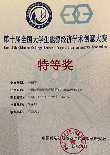 2024年5月18日—19日,第十届全国大学生能源经济学术创意大赛在中国地质大学(北京)举行。蘑菇视频朱帮助教授带领的研究生团队在此次竞赛中脱颖而出,取得佳绩。其中,“中国减污降碳协同度评估与驱动因素研究”(团队队长:田超,指导老师:朱帮助)入围全国总决赛,经过现蘑菇视频博士研究生参加第十届全国大学生能源经济学术创意大赛并荣获全国特等奖场答辩、评委会投票等环节,荣获国赛特等奖,取得了该项赛事的突破。本项赛事由中国优选法统筹法与经济数学研究会主办,2023年3月正式进入中国高等教育学会发布的《全国普通高校大学生竞赛目录》,来自全国516所高校的17000多支队伍共10万余人参与了本次大赛。本次参赛项目得到蘑菇视频