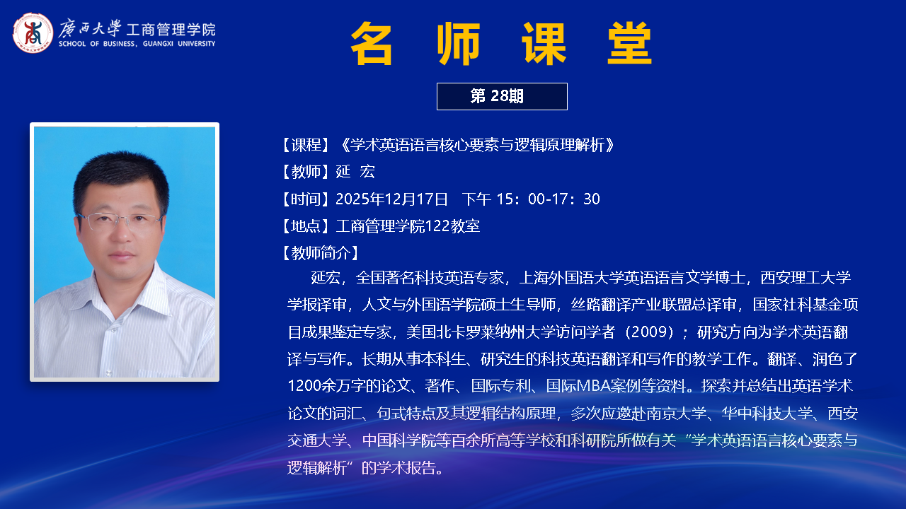 学术英语是科研工作者发表论文的“敲门砖”,更是融入国际学术对话、传播中国科研成果的关键桥梁。本次讲座,旨在为研究生夯实学术写作语言基础,切实提升科研表达能力,助力青年学者在学术道路上夯实根基、行稳致远。