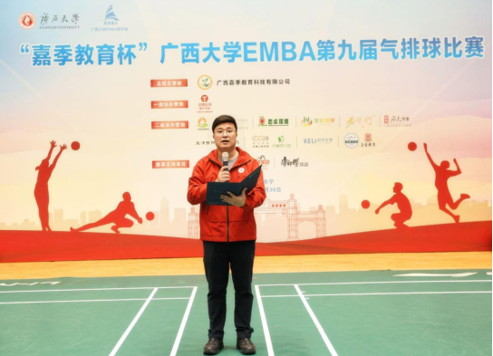 党委书记黄晋、党委副书记肖克宁、EMBA教育中心主任宁雪莲,以及冠名赞助商代表——广西嘉季教育科技有限公司董事长、EMBA第五届同学会执行会长庞勤,秘书长陈轲等嘉宾出席开幕式,与全体参赛队员共同见证这一凝聚同窗情谊、彰显拼搏精神的年度盛事。