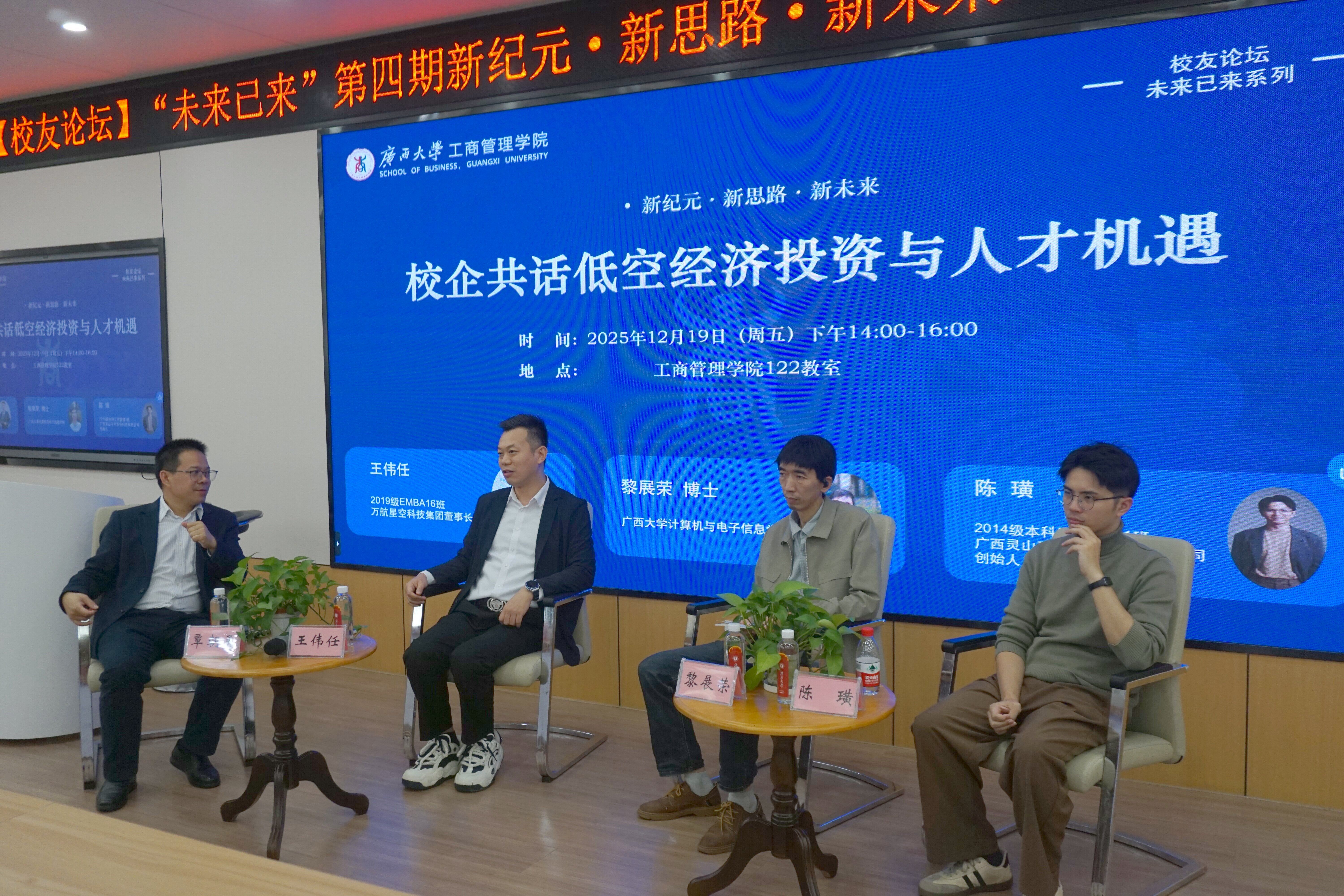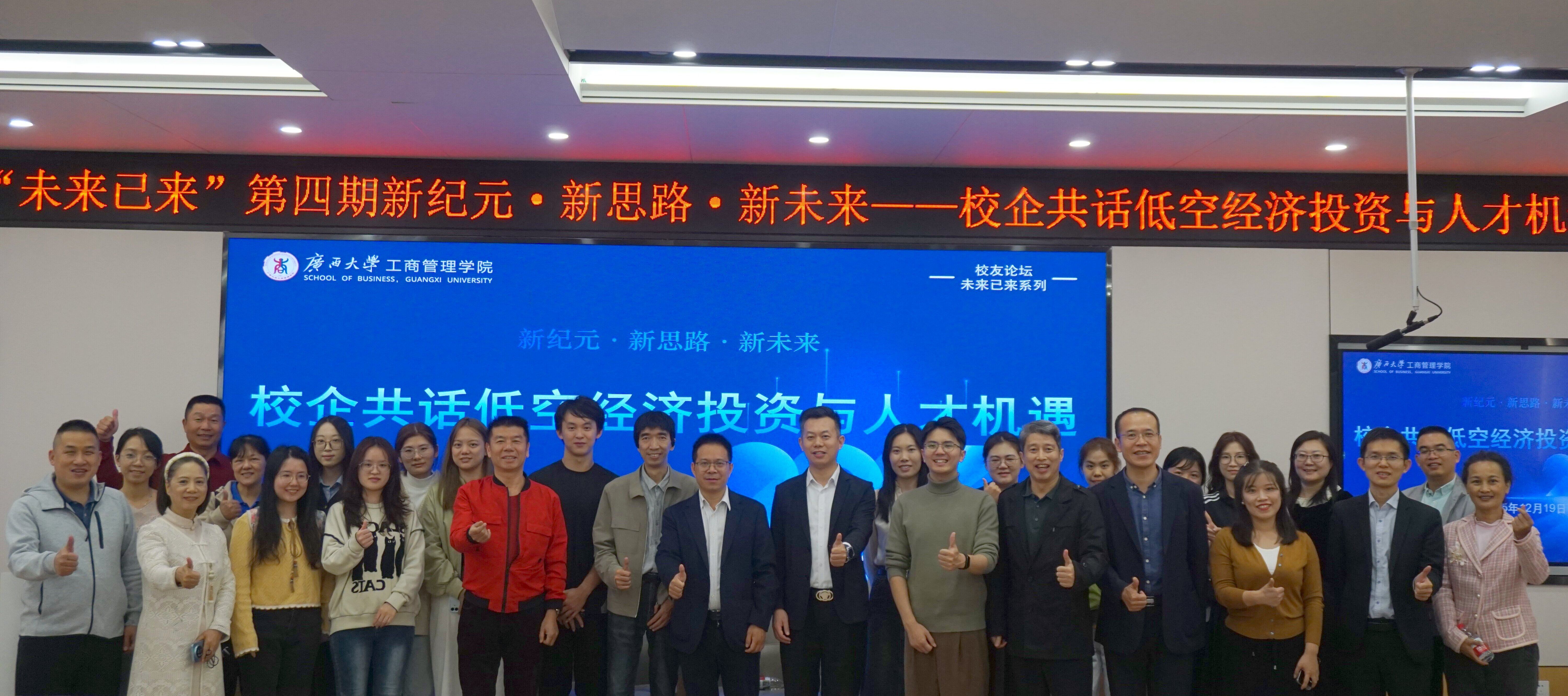 122教室内暖意融融、智慧涌动,“未来已来”系列校友论坛第四期在此隆重举行。本次论坛以“新纪元·新思路·新未来——校企共话低空经济投资与人才机遇”为主题,吸引了来自EMBA、MBA、本科等多届校友、学院师生及学界专家共计60余人,围绕低空经济在广西的发展路径规划、投资机遇挖掘与人才培育创新模式展开深度交流,为八桂大地低空经济发展凝聚智慧力量。