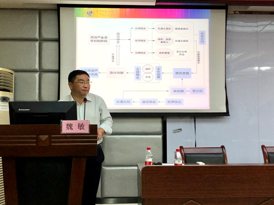 讲座内容主要分为三大部分。第一,文旅融合的发展历程。在这一部分,魏教授提出文化与旅游相结合在市场实践中已经有较长时间的积累,目前也是国家推动高质量经济发展的具体导向之一。第二,旅游业高质量发展的动态演进过程。魏教授概括介绍了文旅融合与旅游产业高质量发展的主体、客体两个层面。主体层面即旅游企业在政策指导下,通过文化创意和技术创新,提高产品附加值;客体层面即旅游企业根据市场需求变化,满足旅游者美好旅游体验需求。从主客体两个层面出发,从路径依赖到路径突破,再到路径发散,最终完成路径优化,实现中国旅游产业高质量发展目标。第三,体验旅游时代如何打破传统观光旅游经济发展的路径依赖和低端锁定问题。欲改变消费路径依赖,从微观到宏观需要解决门票经济、意识局限、制度保持三大困境。这需要我们掌握文化创意视角、解决硬件短板,处理好旅游产业发展过程中质量、效率和动力三者的关系问题,形成政府与市场的主客协同和系统推动效应,而创新又是实现这一目标的重要手段。此外,魏教授还针对政府部门提出了鼓励新型旅游、完善旅游公共服务体系等政策建议。