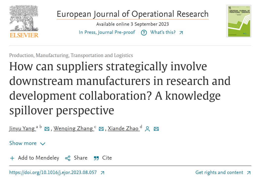 近日,蘑菇视频青年教师阳瑾瑜以第一作者在国际知名期刊《European Journal of Operational Research》在线发表学术论文《How can suppliers strategically involve downstream manufacturers in research and development collaboration? A knowledge spillover perspective》。该期刊2022年影响因子为6.4,为JCR SCI一区、ABS/AJG四星期刊。该期刊致力于发表高质量的原创论文,为运筹学(Operational Research)方法论和决策实践做出贡献,主要刊载的研究主题有:连续优化、离散优化、生产、制造和物流、随机与统计、决策支持、计算智能与信息管理等。