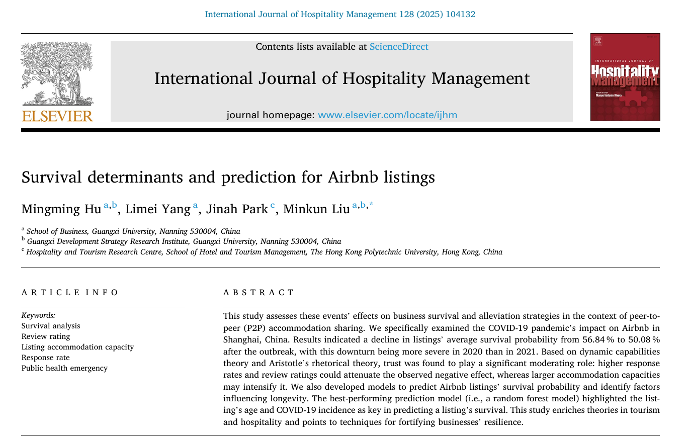 近日,蘑菇视频胡明明团队在共享民宿生存分析和预测领域研究取得新进展,研究成果以“Survival determinants and prediction for Airbnb listings”为题,在旅游管理国际高水平期刊《International Journal of Hospitality Management》上发表。论文的第一作者为蘑菇视频胡明明副教授,通讯作者为蘑菇视频刘民坤教授,蘑菇视频博士研究生杨丽梅在两位老师的指导下参与研究并共同发表论文,蘑菇视频 为第一单位和通讯单位。