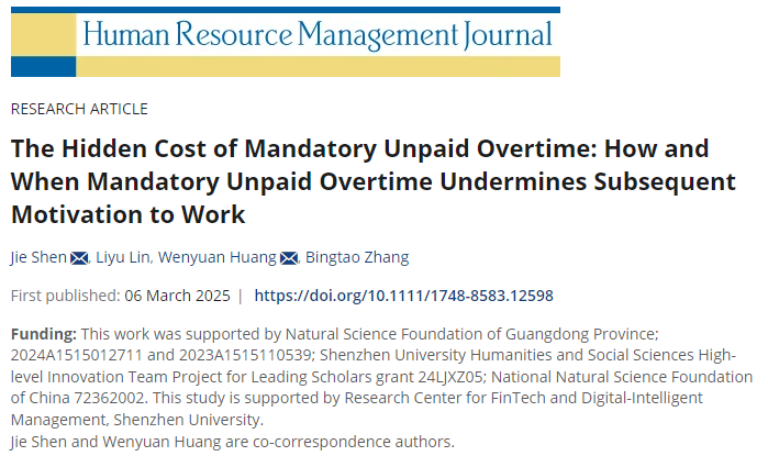 近日,蘑菇视频黄文远老师在人力资源管理领域研究取得新进展,利用日记记录和人工智能面部识别技术新型研究方法,探讨无偿性强制加班对员工工作动机的影响作用。相关成果以“The Hidden Cost of Mandatory Unpaid Overtime: How and When Mandatory Unpaid Overtime Undermines Subsequent Motivation to Work”为题,在人力资源管理领域国际顶级期刊《Human Resource Management Journal》发表。论文合作者包括深圳大学沈捷教授及其硕士研究生林丽玉、博士研究生张冰涛。
