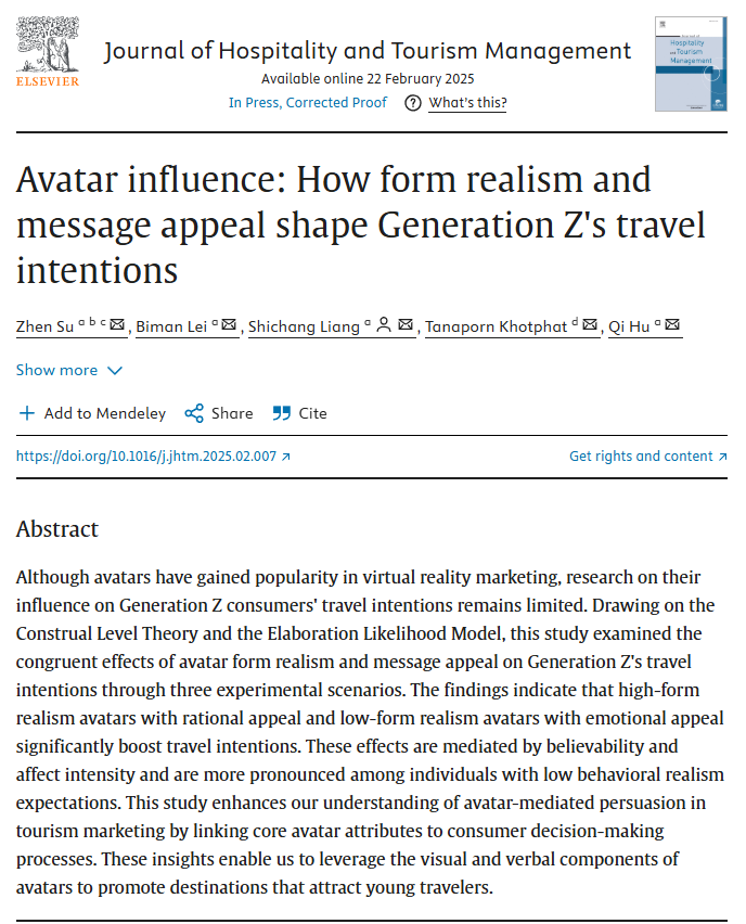 近日,蘑菇视频苏振副教授科研团队在人工智能与文旅消费者行为领域研究取得新进展,研究成果以“Avatar influence: How form realism and message appeal shape Generation Z's travel intentions”为题,在旅游管理国际高水平期刊《Journal of Hospitality and Tourism Management》上发表。论文的第一作者为苏振副教授,通讯作者为梁世昌副教授。蘑菇视频