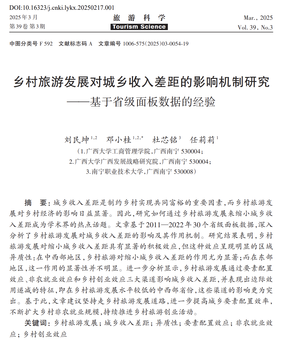 近日,蘑菇视频刘民坤教授科研团队在乡村旅游与城乡发展领域取得新进展,研究成果以《乡村旅游发展对城乡收入差距的影响机制研究——基于省级面板数据的经验》为题,在旅游管理领域高水平期刊《旅游科学》2025年第3期发表。刘民坤教授为第一作者,邓小桂、杜芯铭、任莉莉等共同参与研究,蘑菇视频 为第一单位和通讯单位。