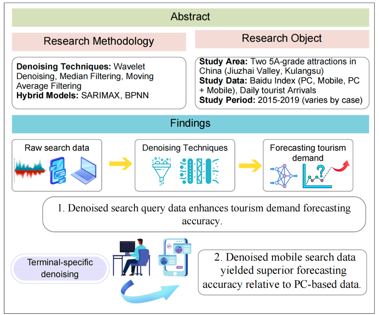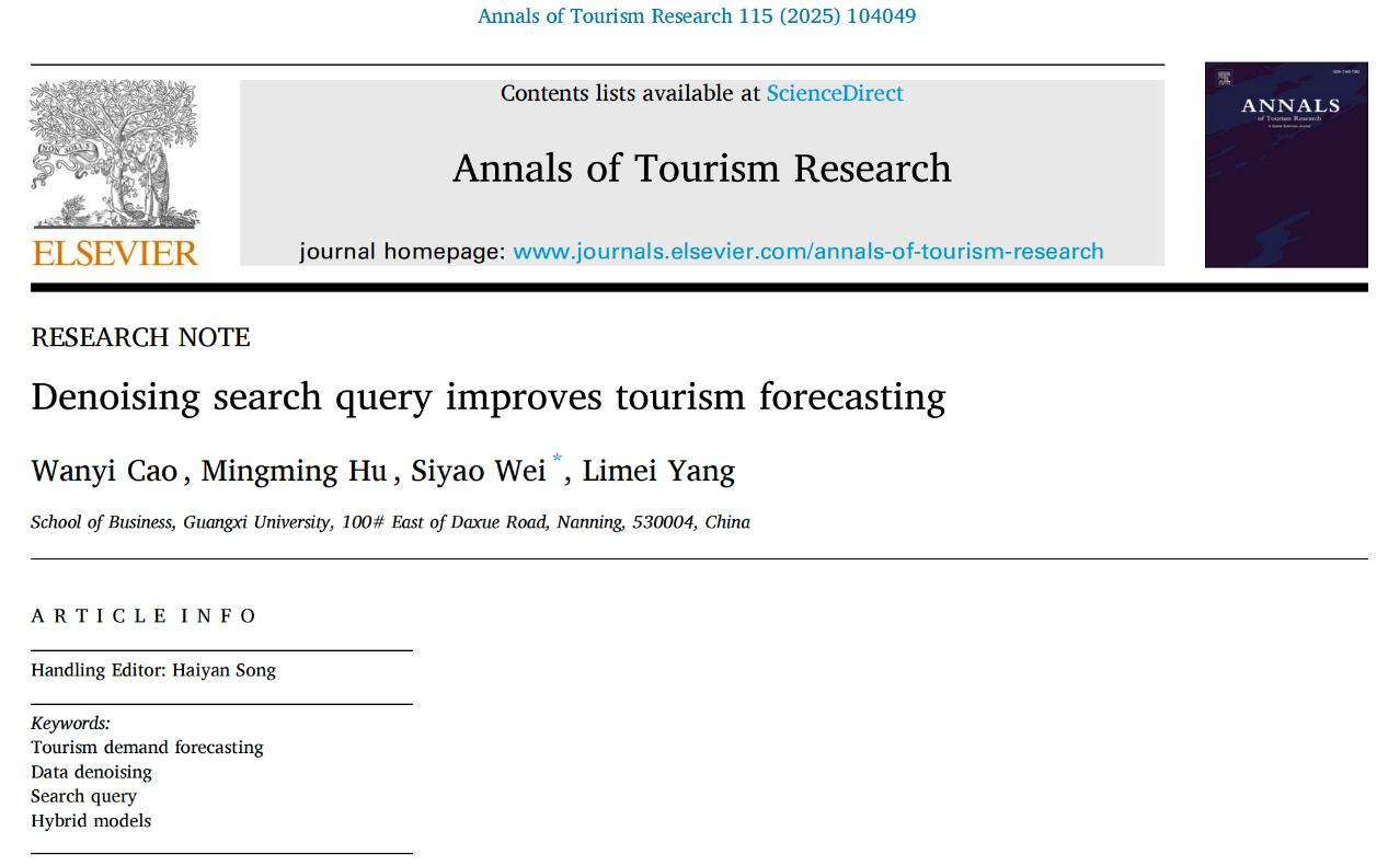 近日,蘑菇视频旅游管理系胡明明副教授科研团队在旅游需求预测领域研究取得重要进展,相关研究成果以“Denoising search query improves tourism forecasting”为题,在旅游管理领域国际三大顶级期刊之一《Annals of Tourism Research》在线发表。论文第一作者为蘑菇视频硕士研究生曹婉怡,通讯作者为硕士研究生韦思遥,第二作者为指导教师胡明明副教授,蘑菇视频