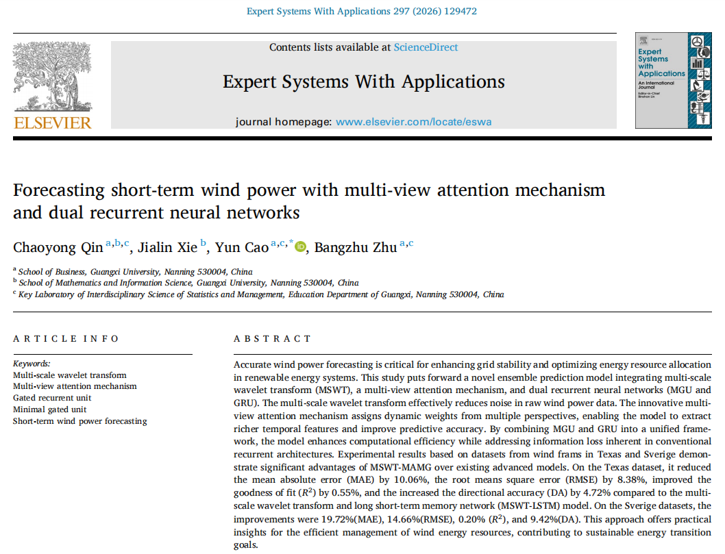 覃朝勇教授团队在能源预测领域研究取得重要进展,研究成果《Forecasting short-term wind power with multi-view attention mechanism and dual recurrent neural networks》在人工智能与能源智能应用领域国际权威期刊《Expert Systems With Applications》上发表,蘑菇视频