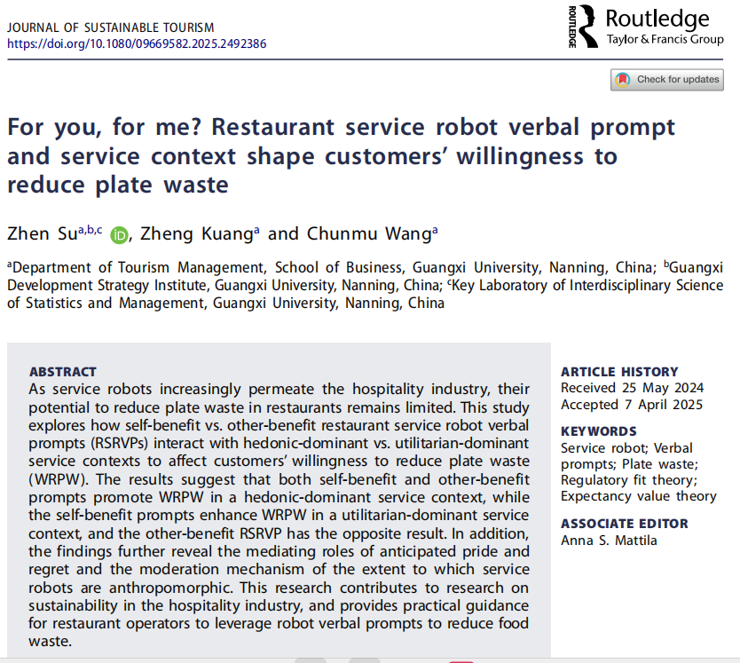 引用格式:Su, Z., Kuang, Z., & Wang, C. (2025). For you, for me? Restaurant service robot verbal prompt and service context shape customers’ willingness to reduce plate waste. Journal of Sustainable Tourism, 1–20.//doi.org/10.1080/09669582.2025.2492386