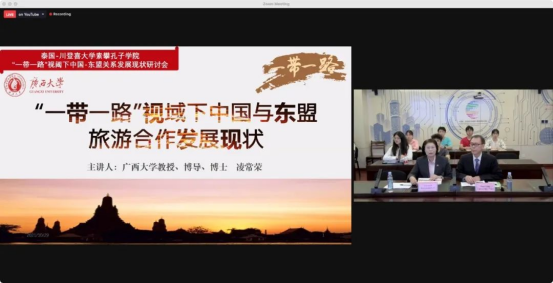 凌常荣教授主讲题为《“一带一路”视阈下中国与东盟旅游合作发展现状》的学术讲座。研讨会由川登喜大学副校长潘查妮·高娜博士(Dr. Pornchanit Kaew-nate)主持,川登喜大学部分校领导、二级蘑菇视频