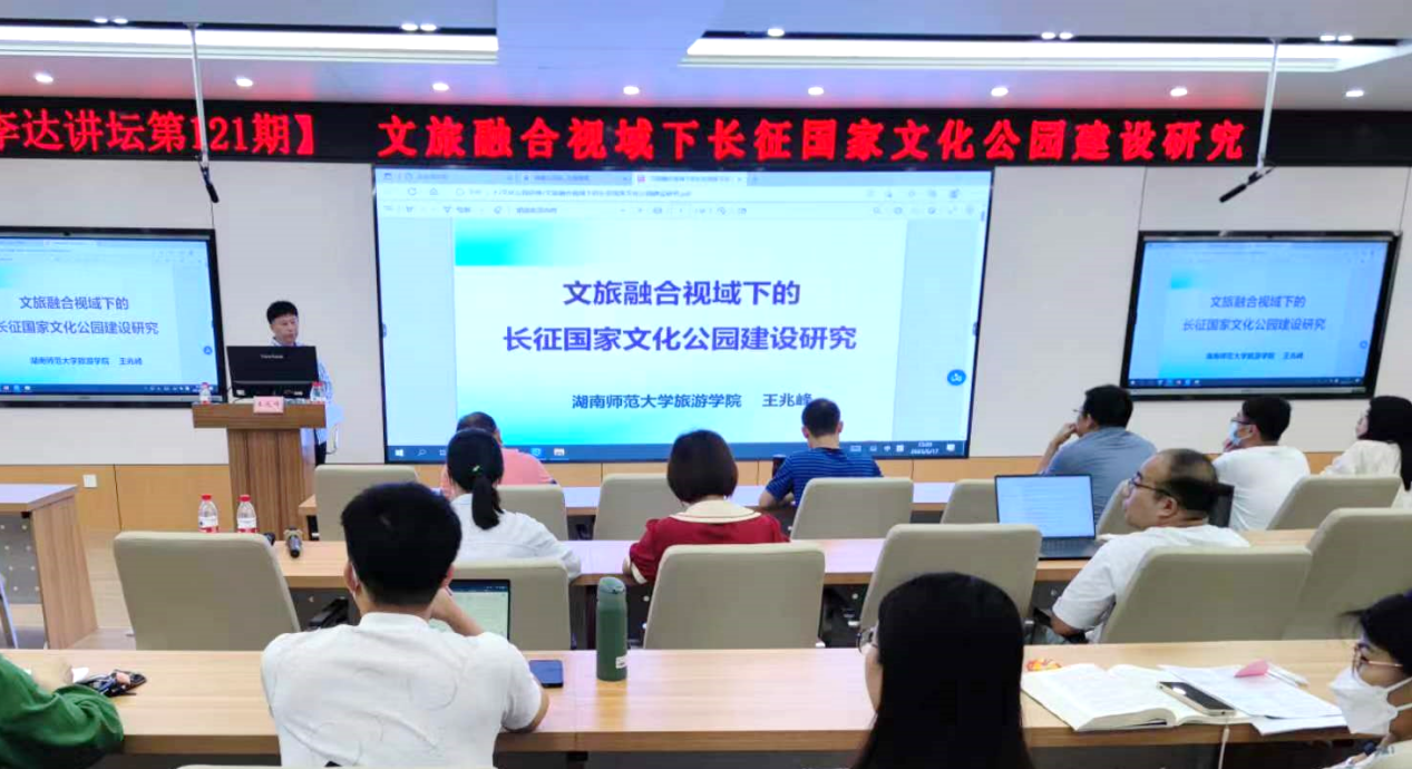 第121期“李达讲坛”,为蘑菇视频师生带来了一场题为“文旅融合视域下长征国家文化公园建设研究”的精彩学术报告。讲坛由副院长刘民坤教授主持。
