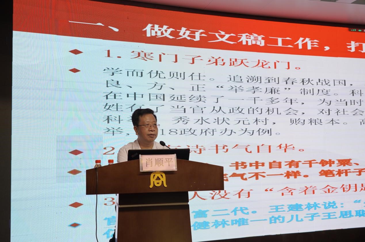 讲座中,肖顺平主任结合自己的工作经历,将文稿工作这项庞大复杂的系统工程分为高质量做好文稿工作之“心”、“道”和“技”三个板块。他指出,做好文稿工作首先要用心,只有真正重视,用心领悟,才能写出好文章。他从文稿分类和写作特点、文稿的基本属性、文稿写作的总体要求以及文稿写作的一般方法四个方面阐述了高质量做好文稿工作之“道”。同时,肖顺平主任结合自身多年撰写文稿的经验从把握好“着重点”、留下“印象分”、跳好“四部曲”总结了高质量做好文稿工作之“技”。