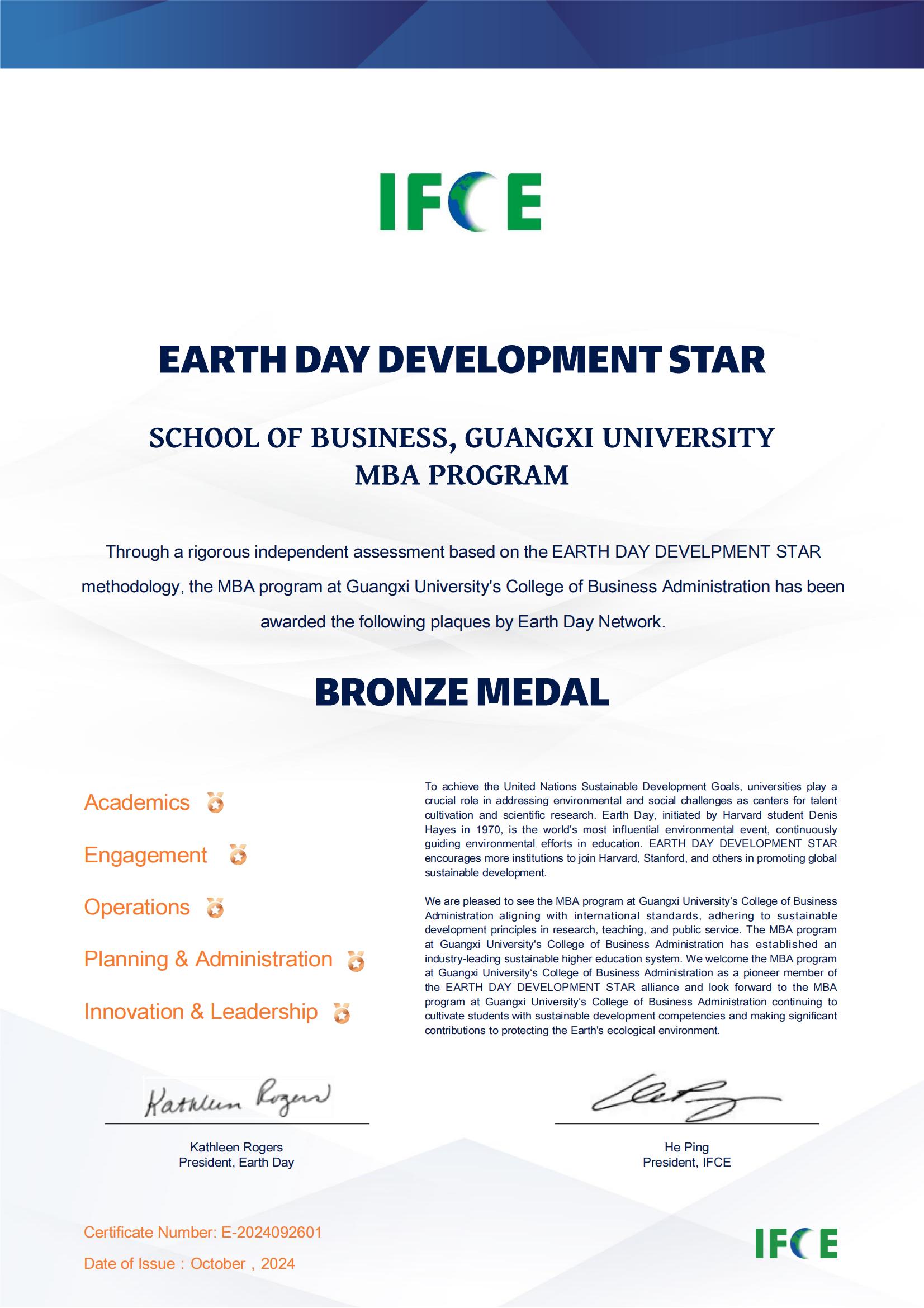 2024年10月蘑菇视频MBA项目获得EARTH DAY DEVELOPMENT STAR铜牌认证,表明该项目在ESG和可持续发展领域得到了国际认可。